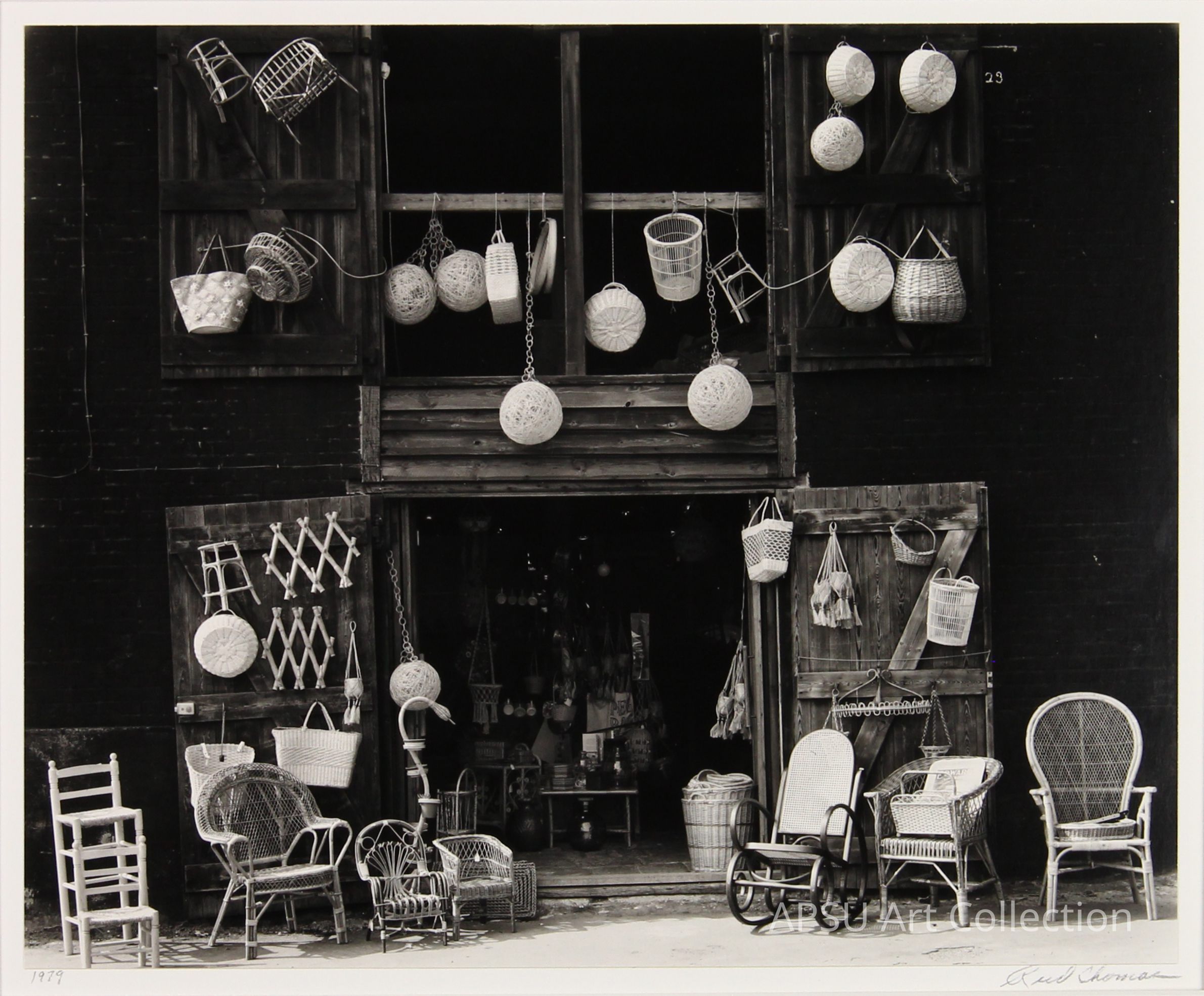 This black and white photograph captures a quaint and charming shop front, adorned with an array of baskets, wicker chairs, and traditional decorative items hanging from the dark, wooden beams of the building. The exterior reveals a rustic aesthetic, highlighted by the textures and shadow play across the surfaces, lending a nostalgic and timeless vibe to the scene.