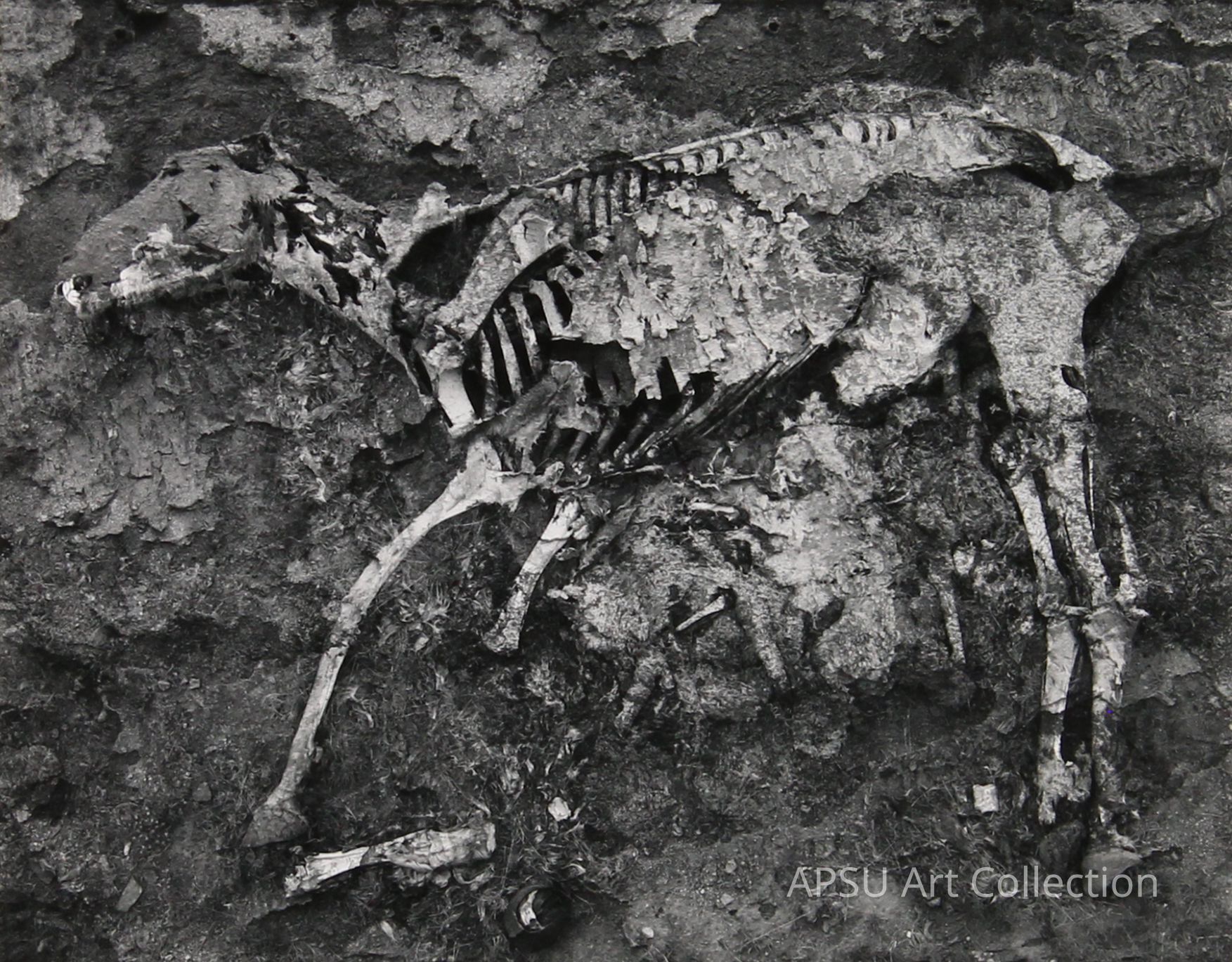 An image of a dead horse skeleton laying in the desert.Collection