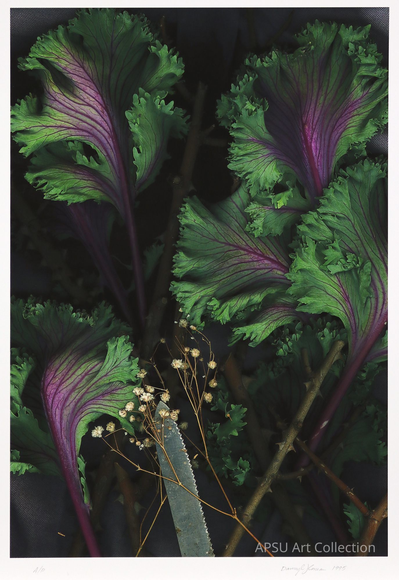 savoy cabbage, baby's breath, knife, thorny branches, and a denim like fabric as the background scanned and printedCollection