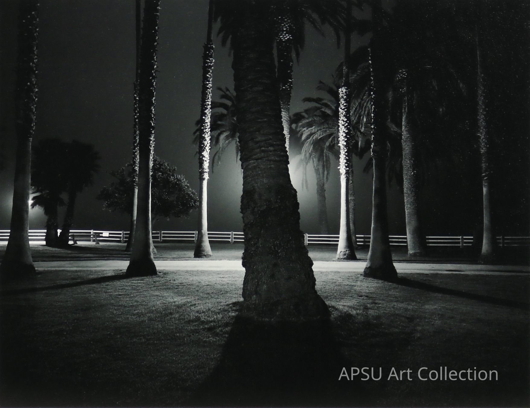 Black and White Photograph of palm trees.One palm tree in the middle blocks a bright light from our view.Collection