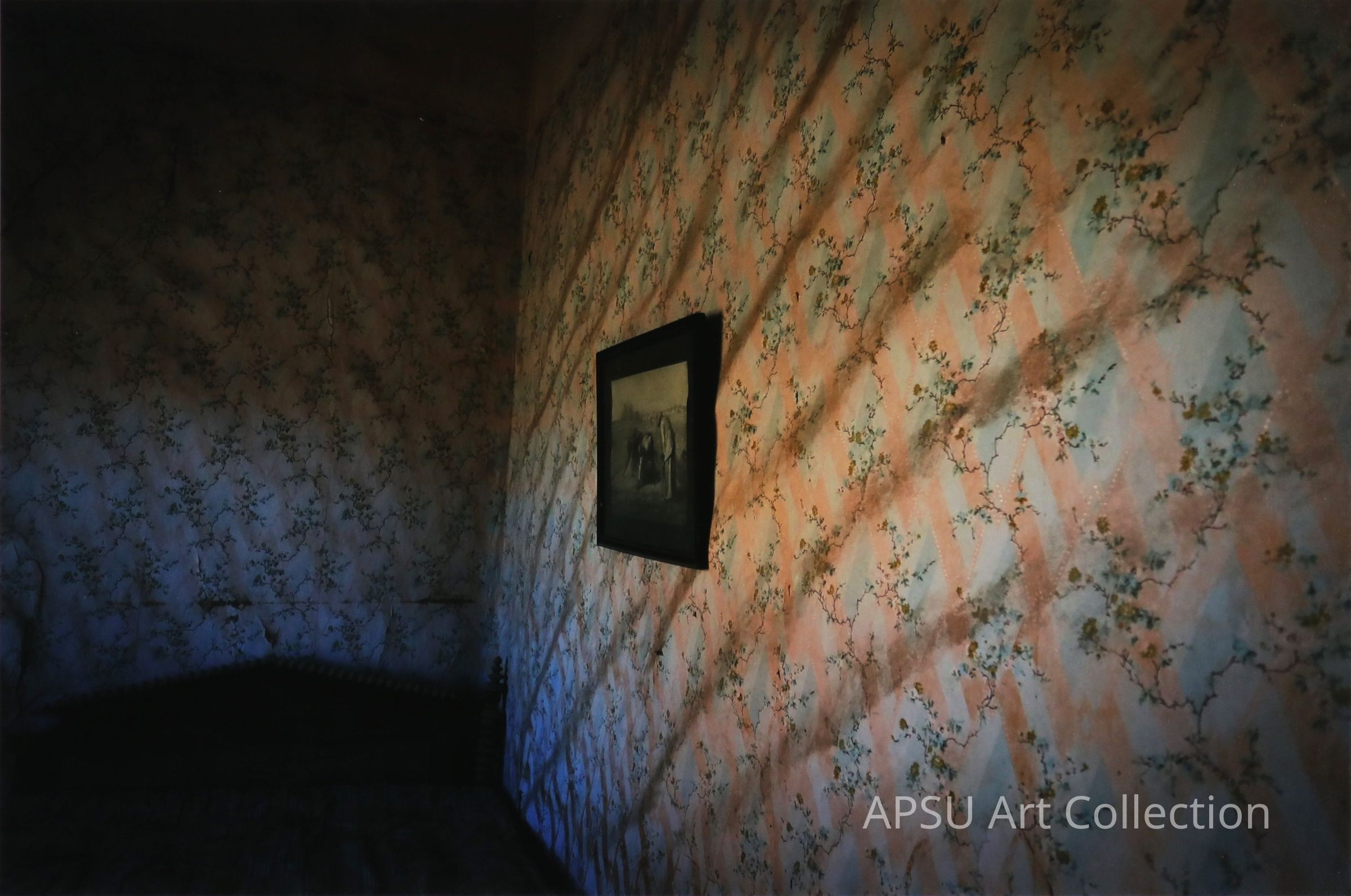 A color photograph of a dark room with pink and blue flowery wall paper, a bed with a wooden frame, and a black and white photograph or drawing of three men framed and hung on the wall.Collection