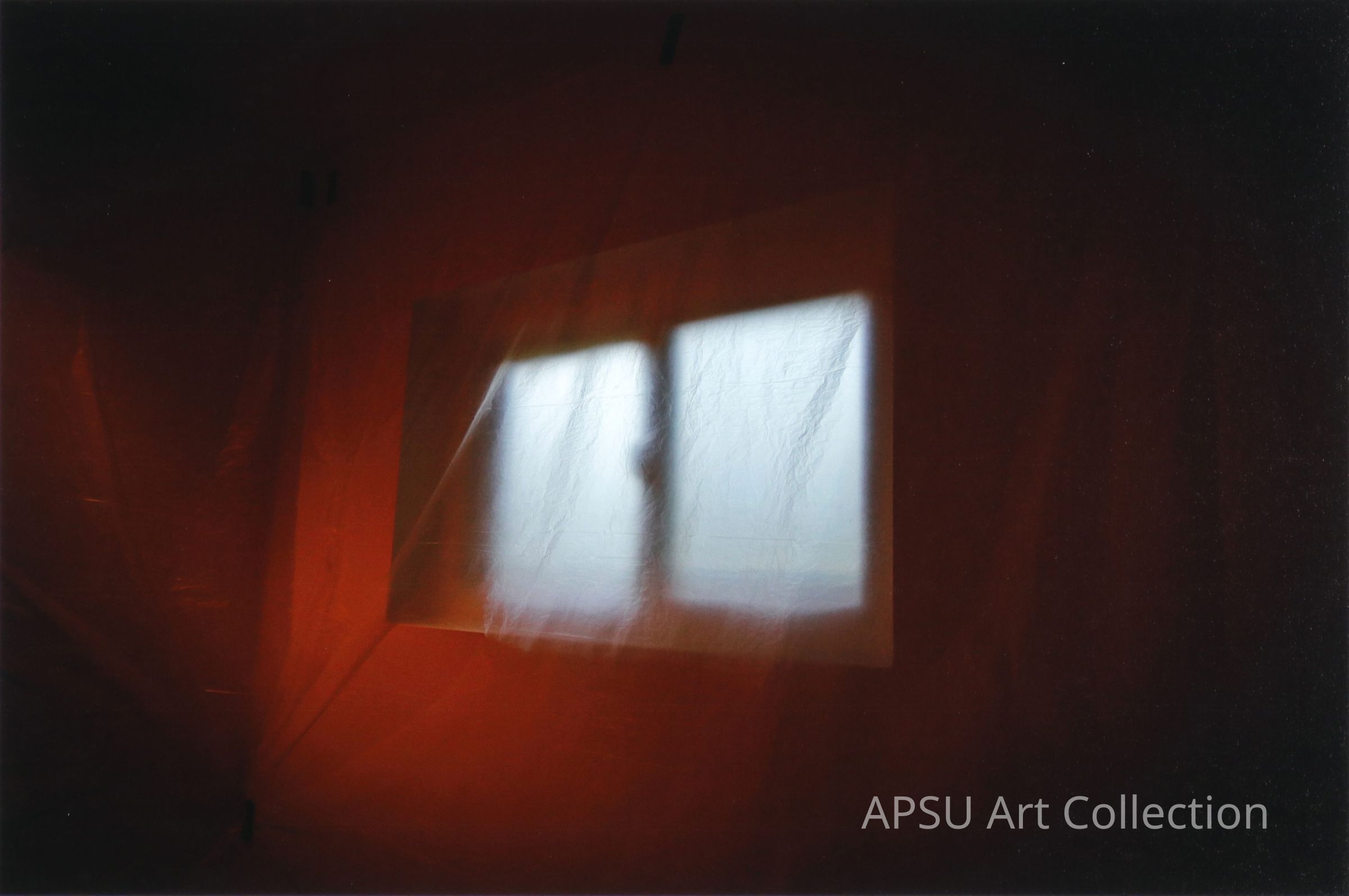 Color photograph of a room lit by a red light and the walls and window are covered by plastic. Blue/white light shines in through the window.Collection