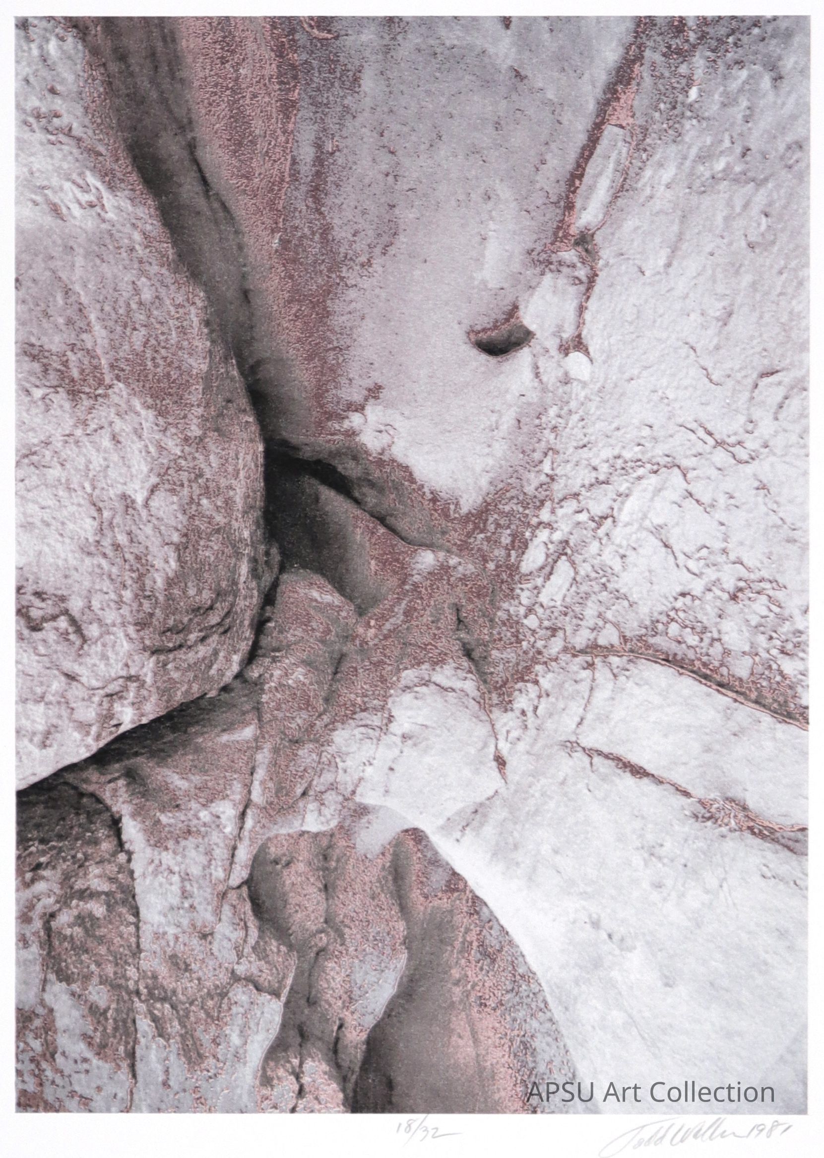 The image depicts a textured surface resembling rocks with varying tones and patches of dark pink and gray, showing what appears to be natural erosion or formations, evoking a raw yet serene aesthetic; the bottom of the image shows the number "18/32" and a signature, indicating it might be a part of a limited series by an artist.