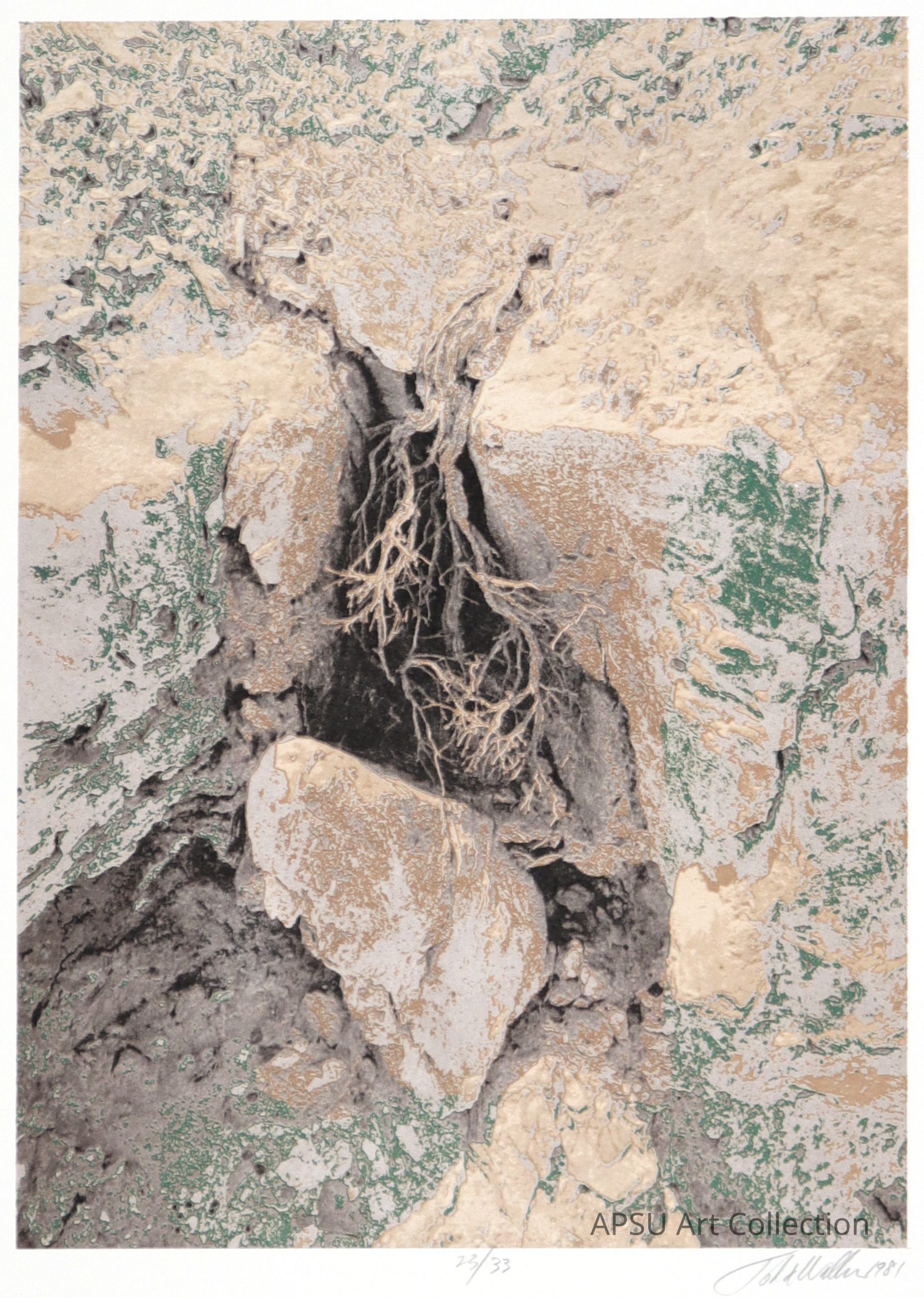 A hole in a cliff with roots and rocks. Dark green, beige, tan, and gray.Type of Print