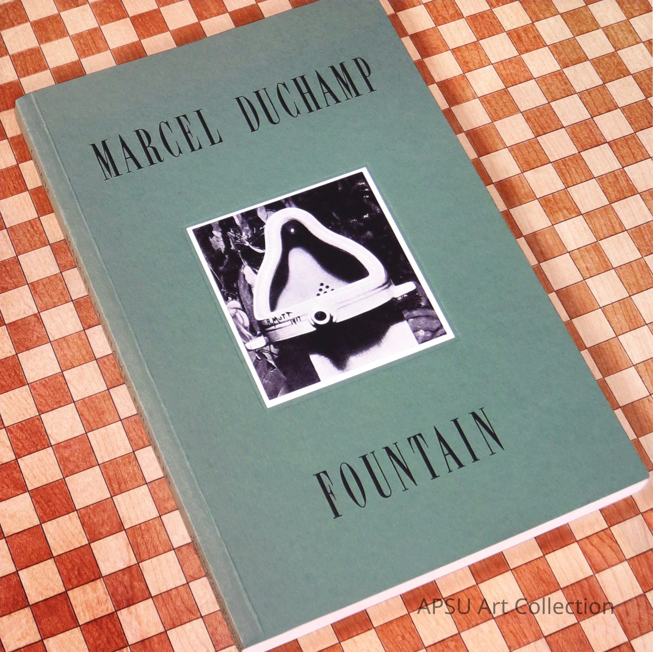 a blue-green book titled "Marcel Duchamp: Fountain" laying on top of a checkered patterned wood.Collection