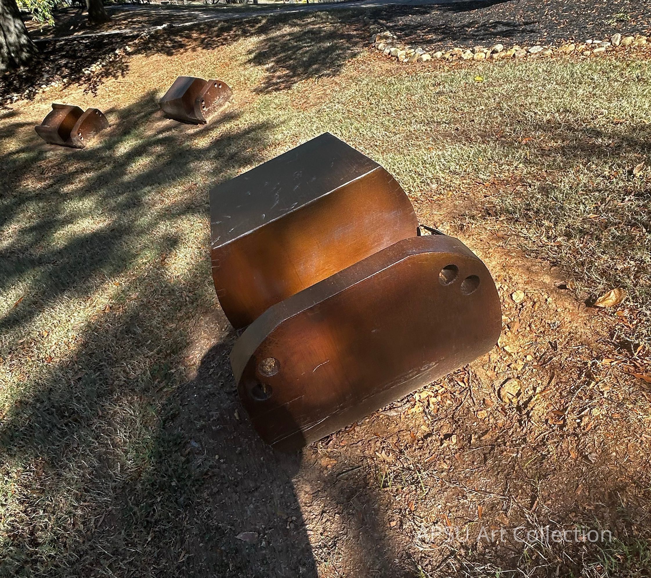 Three steel structures painted brown that look like racecars made of carboard. They look as if they are racing around the bowl outside of the library.Collection
