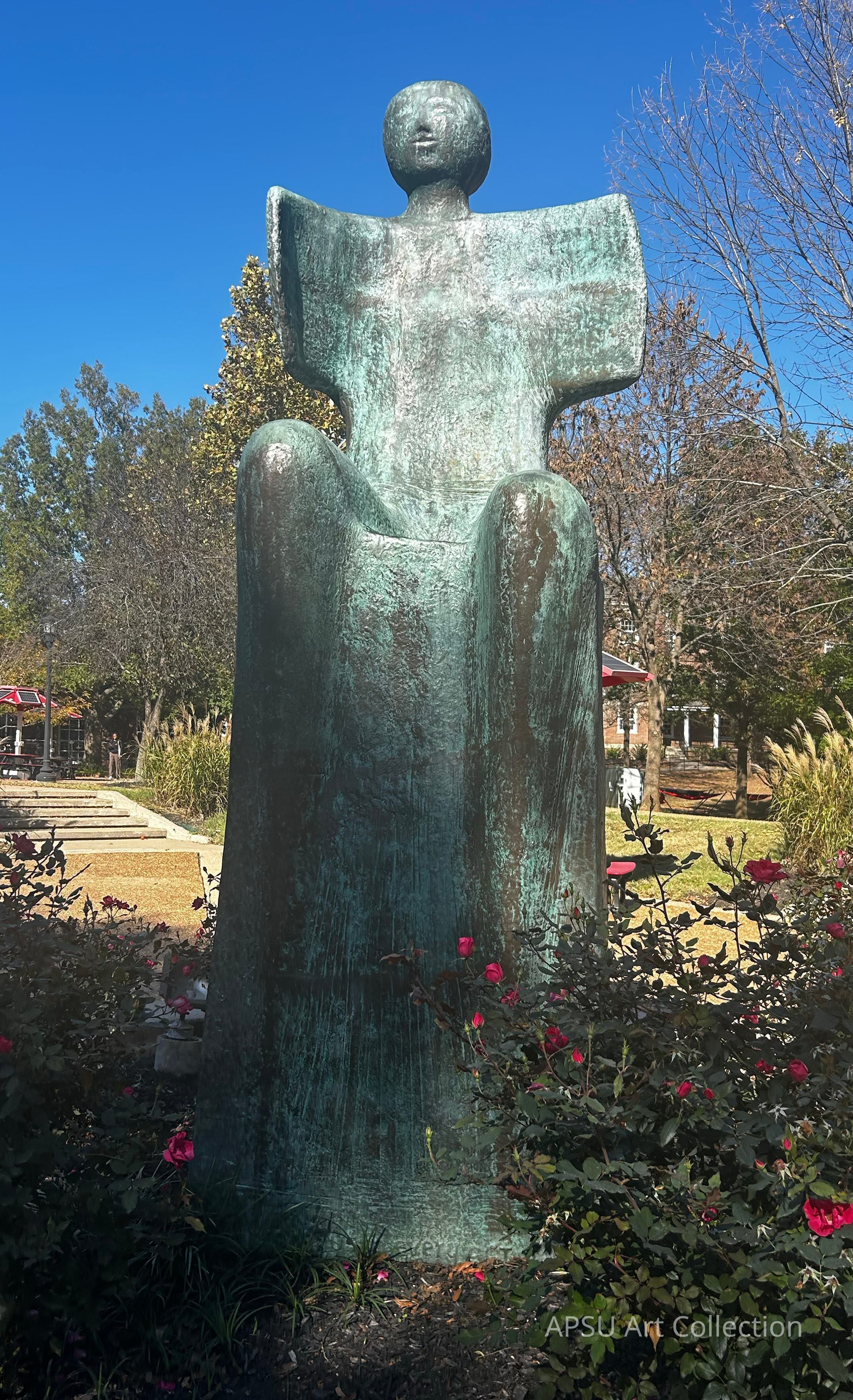 Large bronze sculpture of a figure sitting peacefully, oxidized to a blue-green color.Type of Sculpture