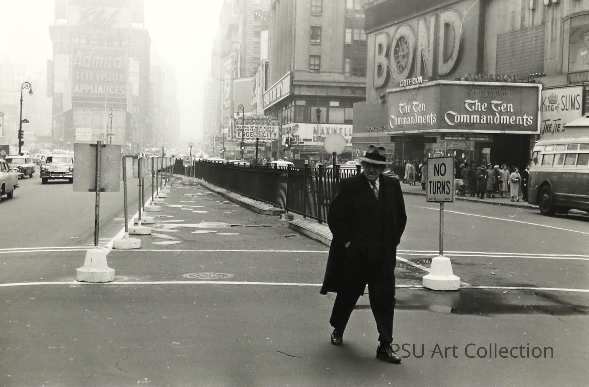A Gelatin Silver Print photograph of an older man walking in the streets of Times Square. The Criterion is located on the right, while the man is positioned next to a "No Turns" sign.Collection