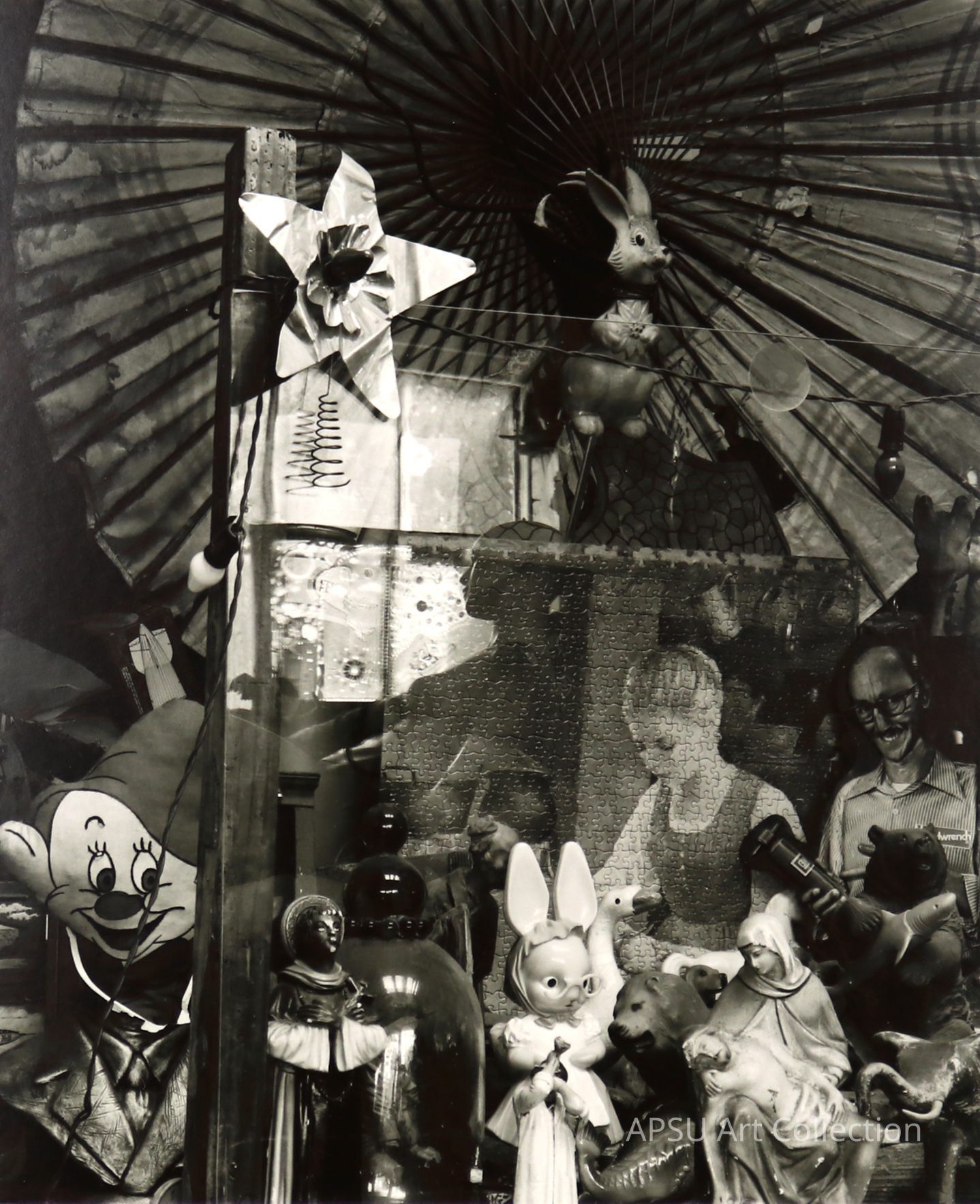The image displays a densely packed assortment of objects and figurines, including a prominent rabbit figure near the top right under an umbrella, surrounded by a mix of dolls, religious figures, toys, and other eclectic items, all set against a textured, somewhat reflective backdrop, creating a complex and intriguing visual collage.