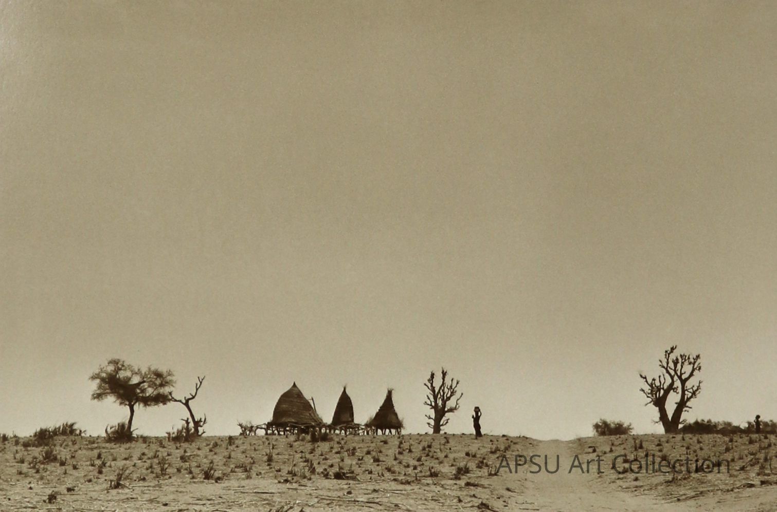 A sepia toned photograph of a Nigerian landscape. A woman is located towards the center, next to a grouping of huts.Collection