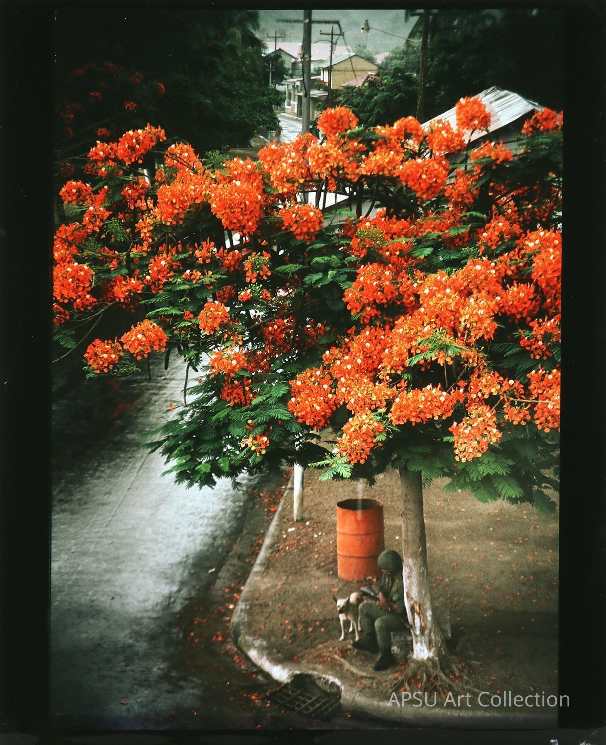 Photograph of a soldier and his dog sittin under a vibrant, red-blossomed tree. they are also positioned next to a metal can.Collection