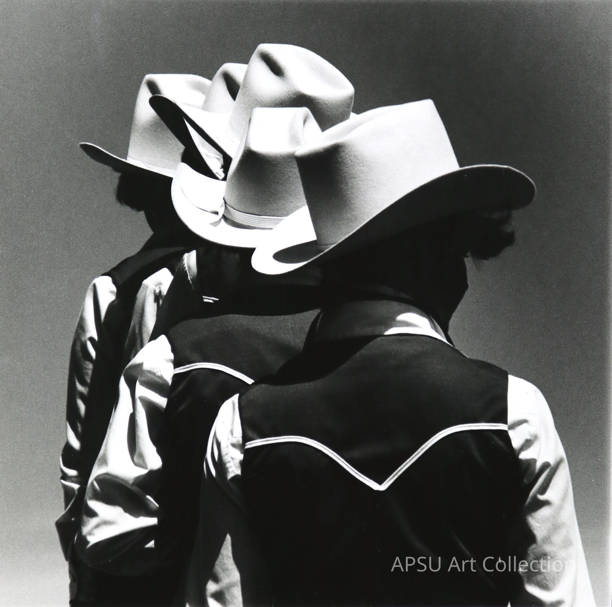 Photograph of five cowboys/cowgirls in a row. All of their light colored hights contrast with the darkness of their vests. You can only see the backs of them, no faces.