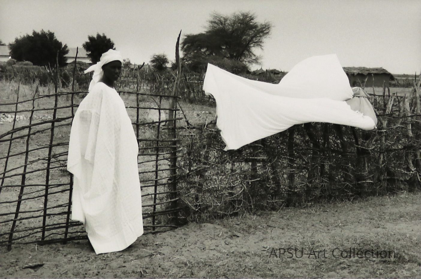 Photograph of a Senegalese woman next to a white sheet.
