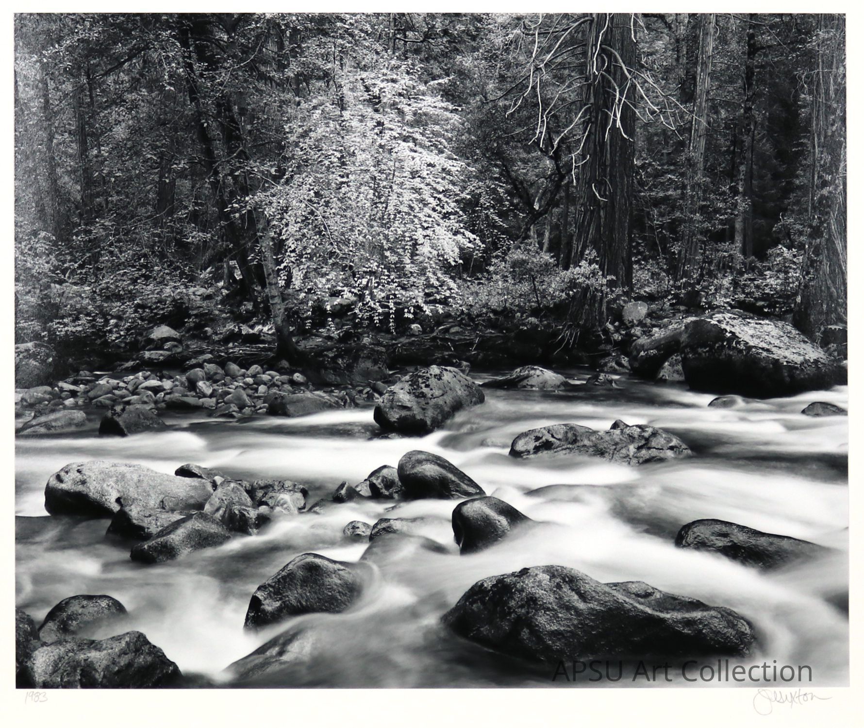 This black and white photograph captures a serene forest scene where a smoothly flowing river meanders around scattered rocks. Lush trees, some with bare branches, line the riverbank, and their dense canopy suggests a secluded woodland retreat. The soft-focus effect applied to the water gives it a misty, magical appearance, enhancing the tranquil and timeless feel of the landscape. The clarity and contrast of the image accentuate the textures of the rocks and foliage, making the scene appear ethereal and inviting.