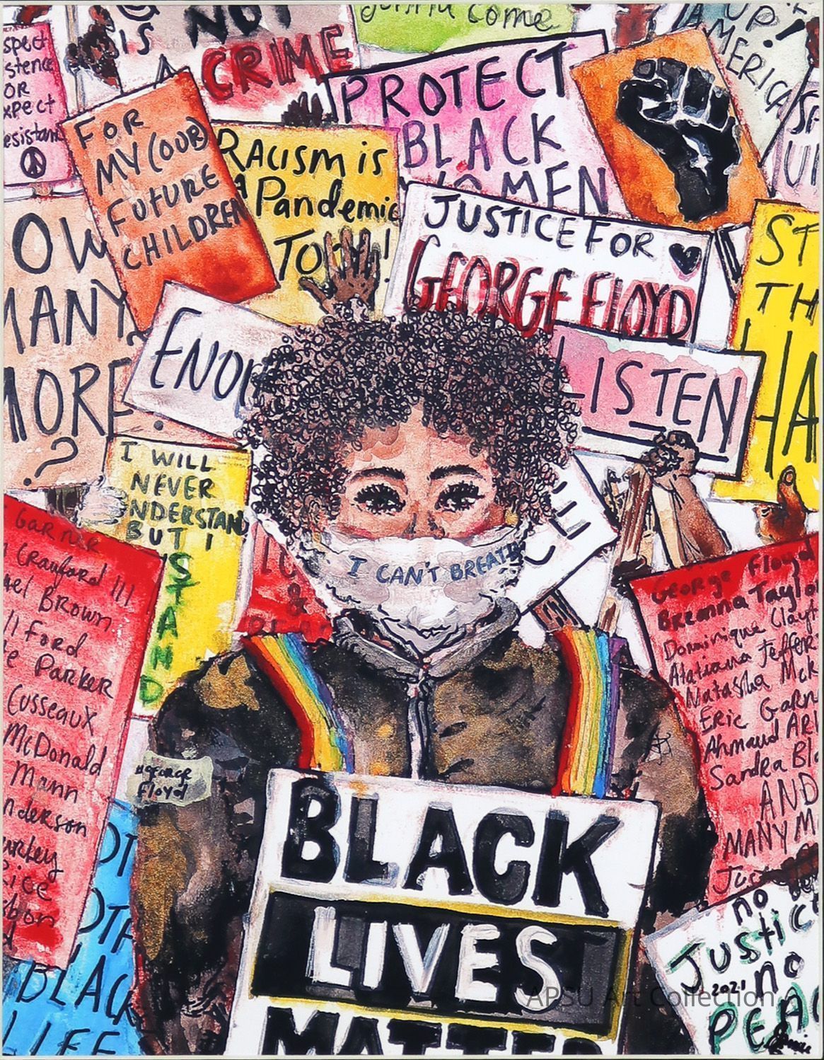 Digital print of a person holding a Black Lives Matter sign, with a collage of other signs in the background.Type of Drawing