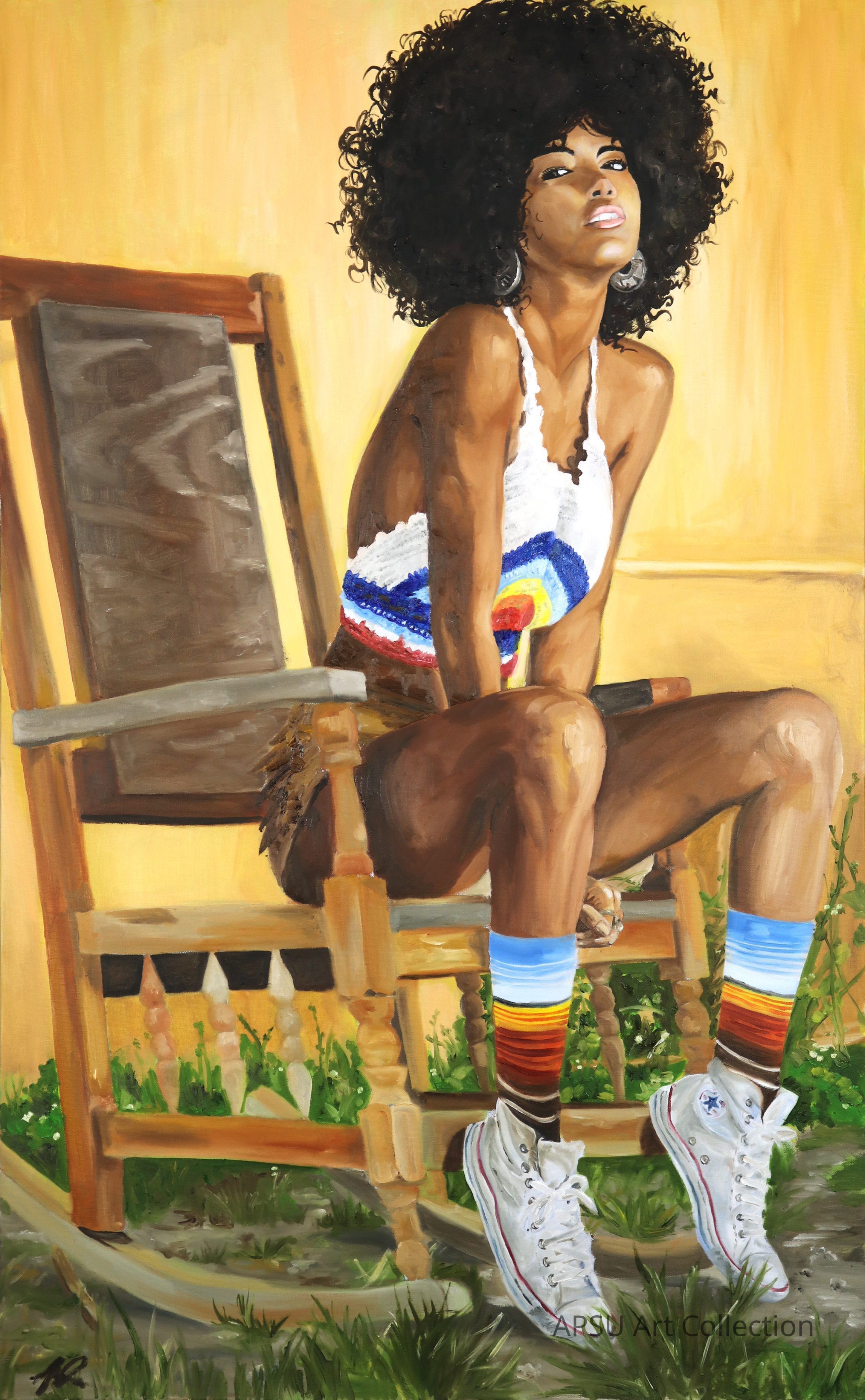 This painting features a Black woman sitting on a wooden rocking chair, exuding a strong and confident aura. She sports a voluminous, curly afro and wears a colorful striped tank top paired with denim shorts. White sneakers and vibrant striped socks complete her look. Her pose is relaxed yet expressive, with crossed arms and legs, and she gazes upward with a thoughtful expression. The background and chair are rendered in warm yellow and brown tones, highlighting her as the central figure.