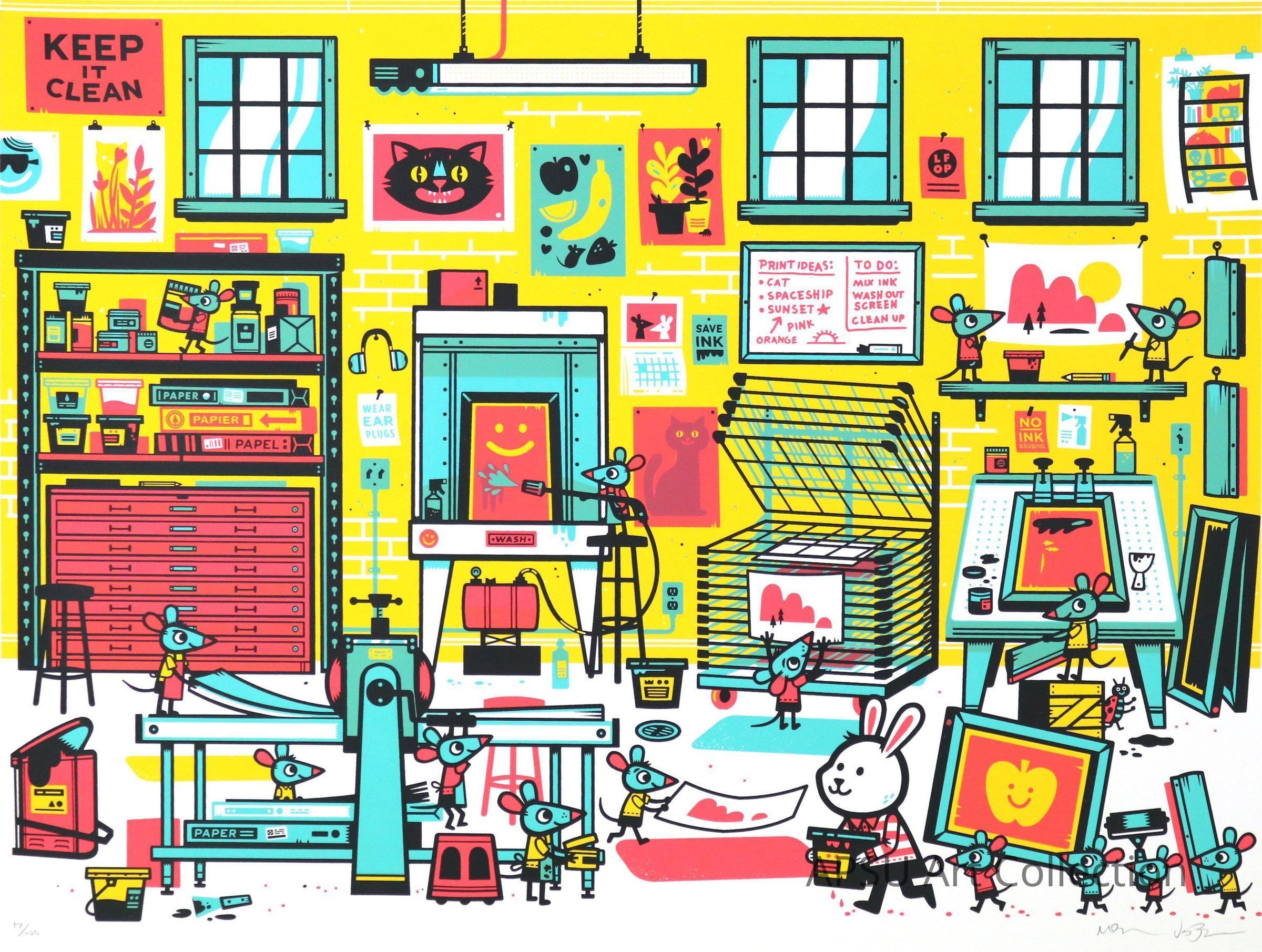 A screenprint scene of a bunch of mice in a printmaking shop.Type of Print
