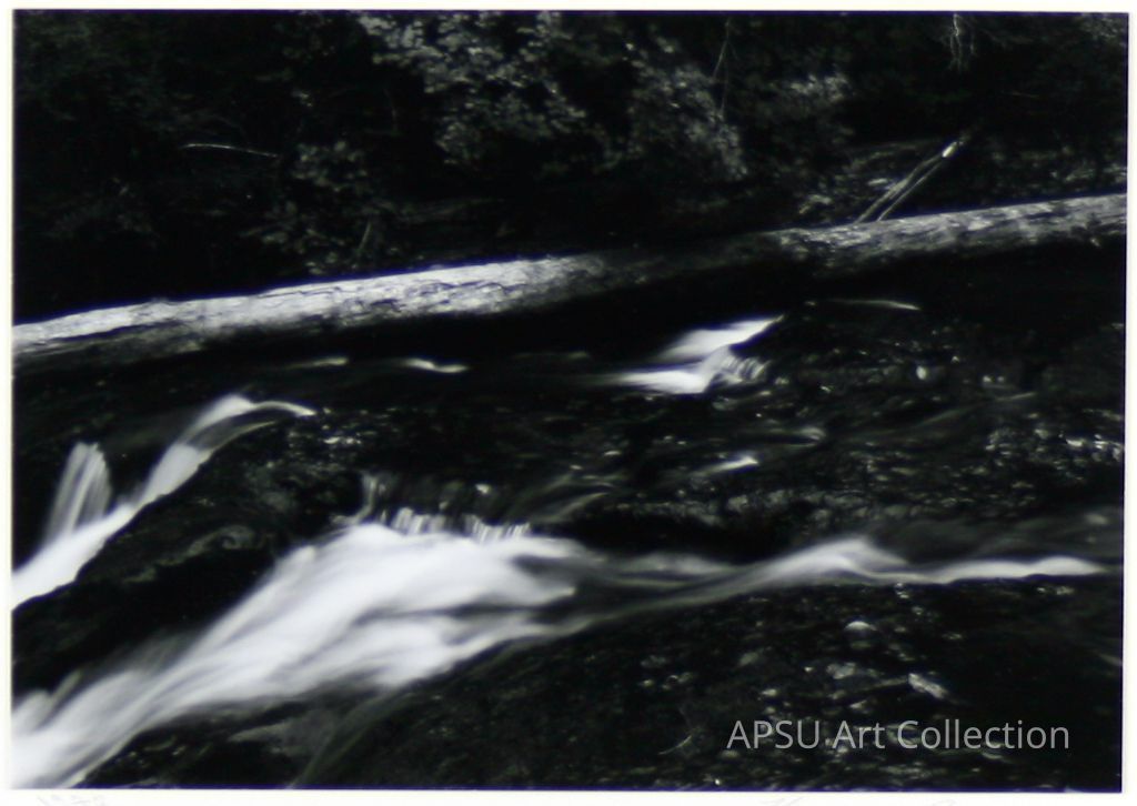 Black and white gelatin silver print of a log crossing the picture plane above Alsea Falls, Oregon, the water falling creates a white effervescent mist that contrasts with the dark rocks and woods behind the falls, 1972Collection