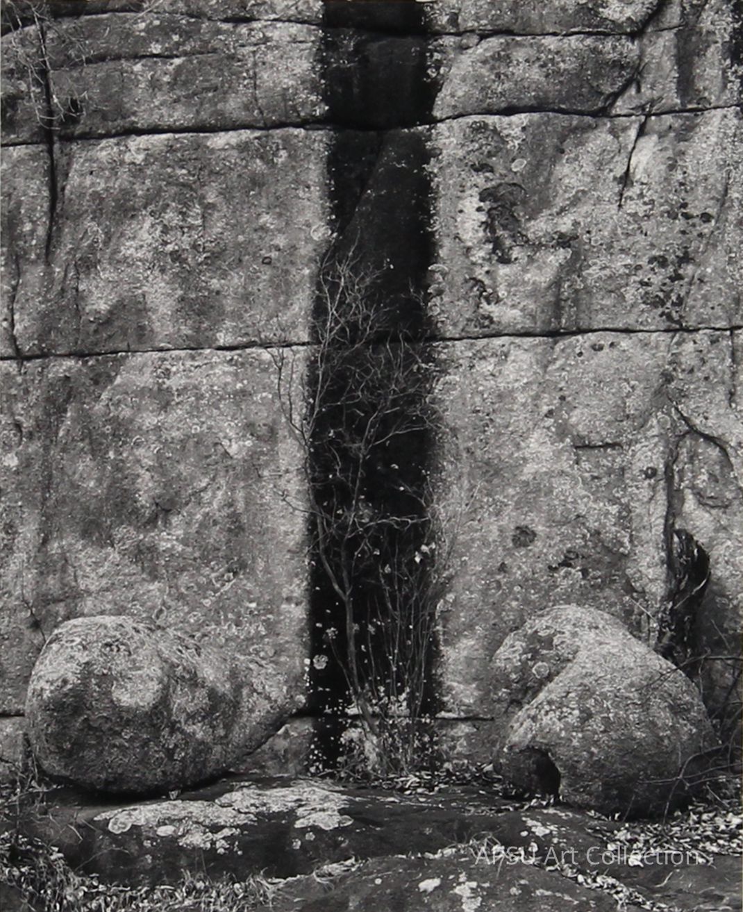 Black and white photograph of a flat rock face. The composition is divided symmetrically by a dark segment of rock. A small grey tree, also in the center of the composition, contrasts the dark area which crosses the composition vertically.