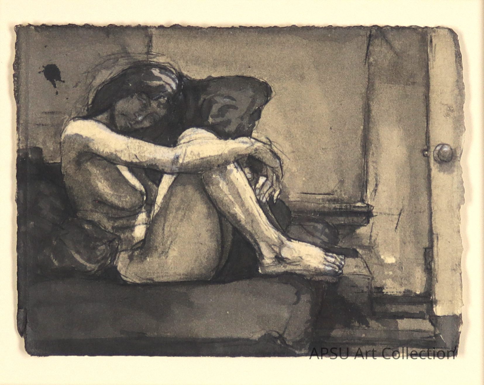 Female nude sitting on couch with arms around knees.Type of Drawing