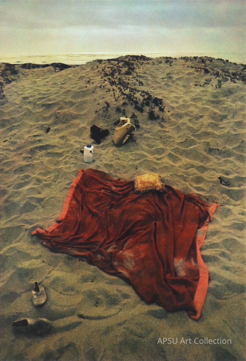 Unknown landscape/still life of a blanket and objects in a desert. Donated with Robertson collection. No artist information.Collection