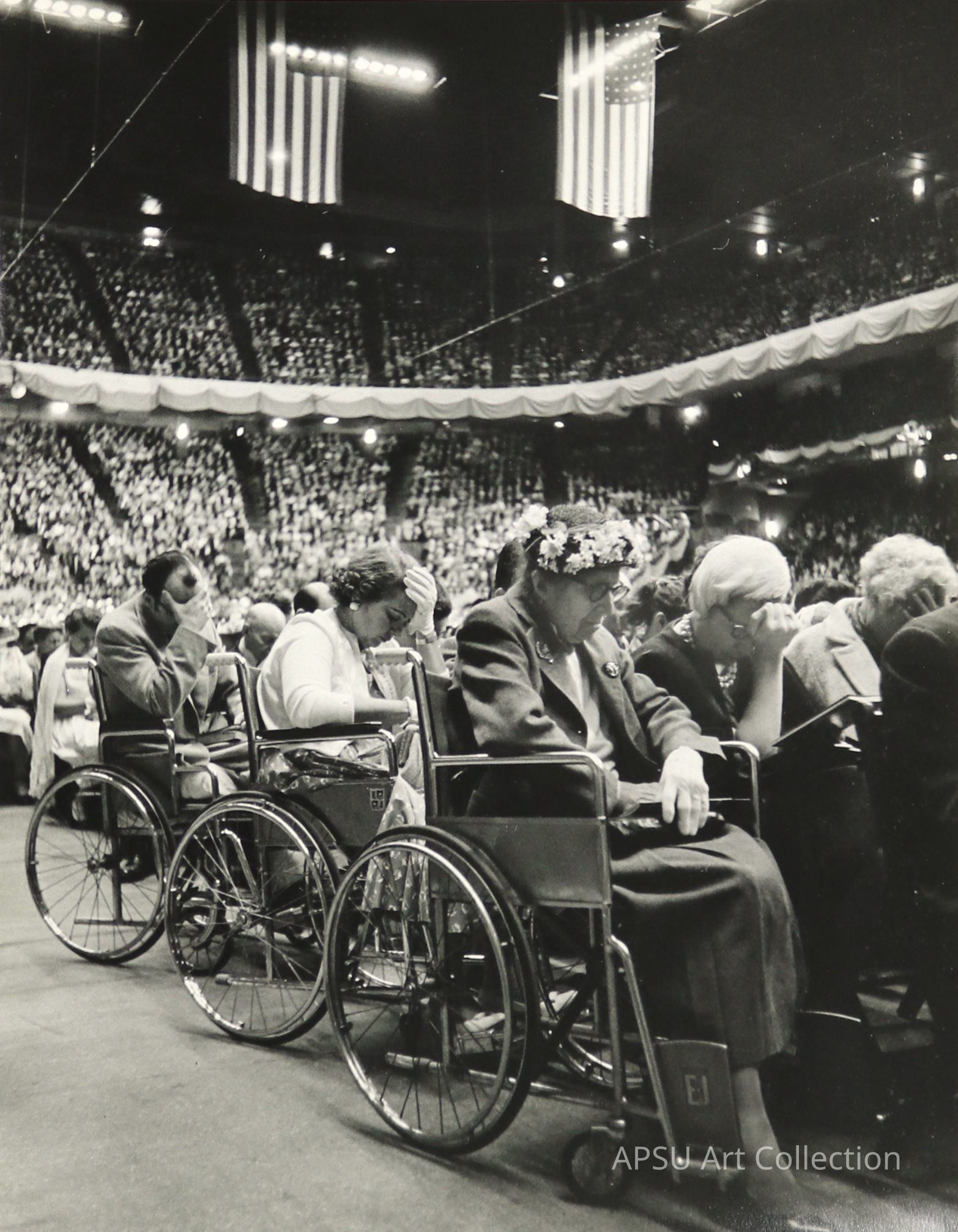 Gelatin Silver Print photograph of the elderly in wheelchairs sitting in the front of a crowded Madison Square Garden. There are two American flags hanging from the ceiling.Collection