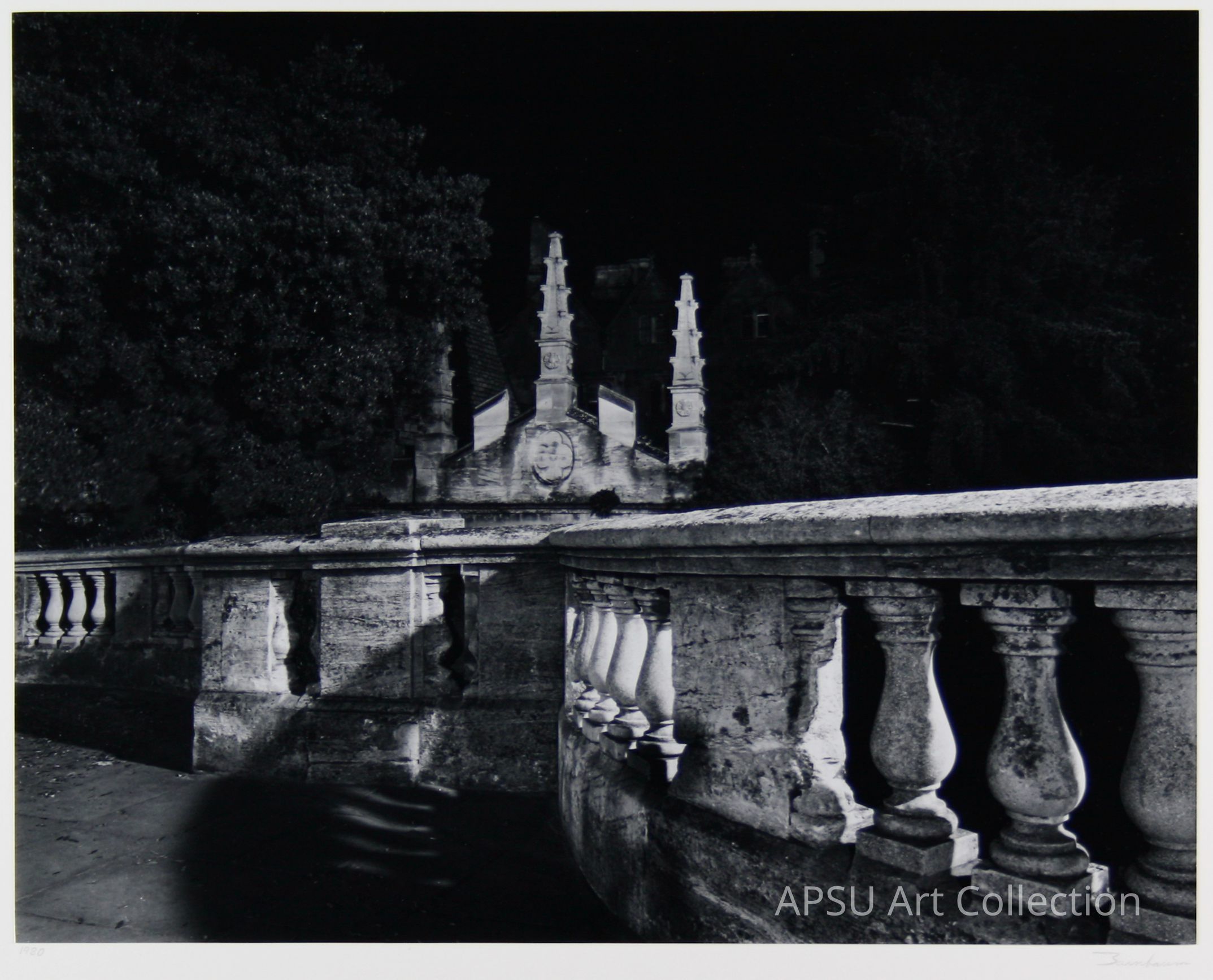 In the black-and-white image, an architectural structure with intricate stone balustrades is prominently featured in the foreground, showcasing detailed craftsmanship through its textured columns and ornate patterns, evocative of historical or classical design influences. In the background, two tall, slender towers stand on either side of an elaborate central facade, which is adorned with a circular emblem that adds an element of grandeur and symbolism to the scene.