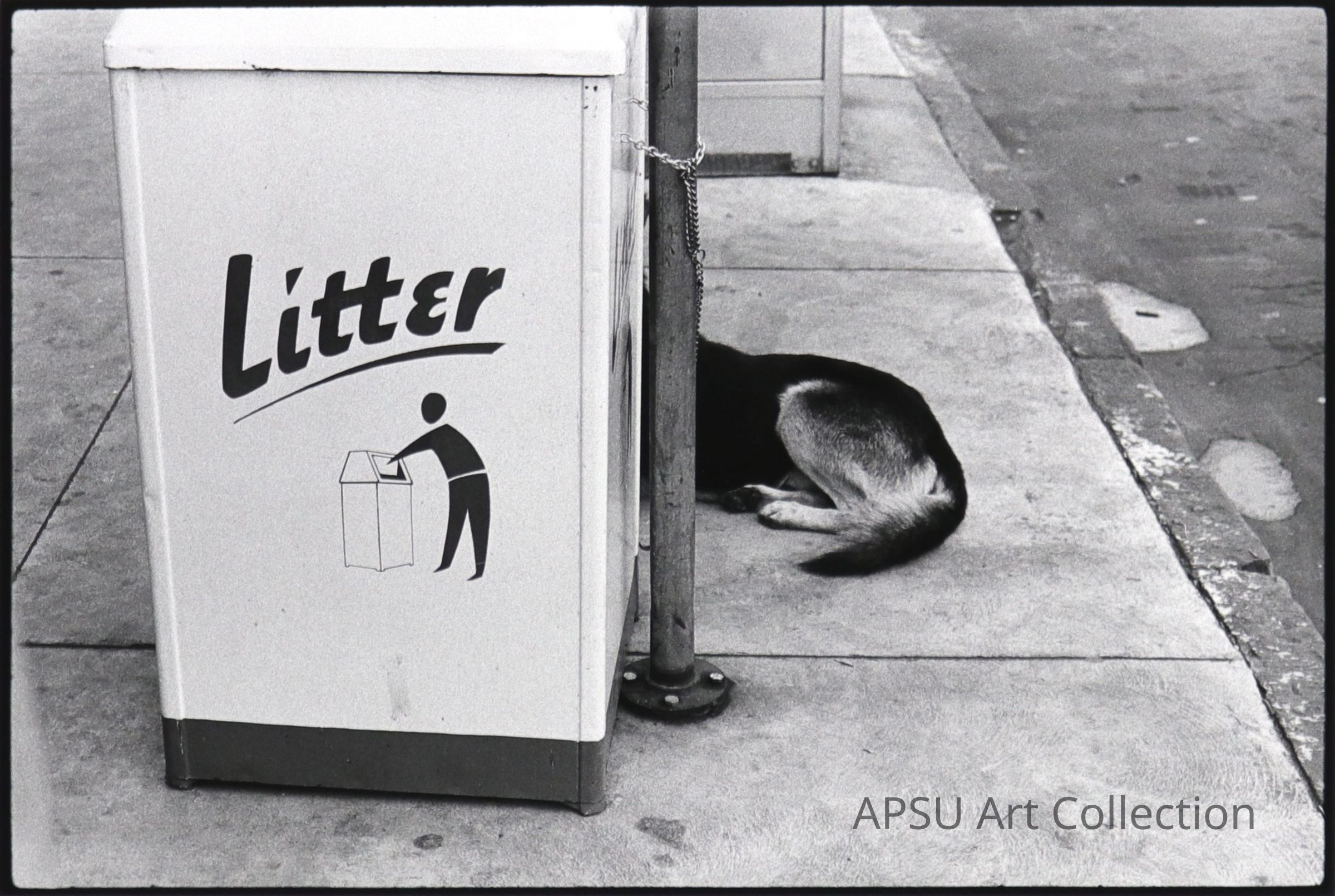 Black and white photograph of a trash can reading "Litter" and a dog sitting behind itCollection