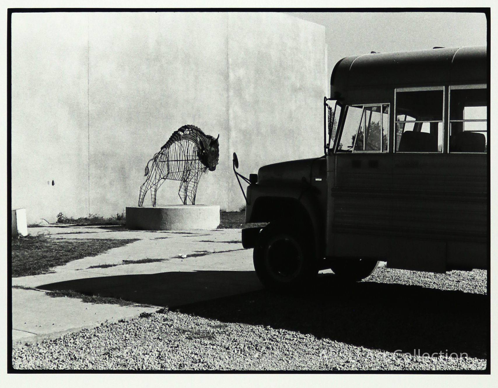 Photograph of a buffalo statue facing a bus head-on.Collection