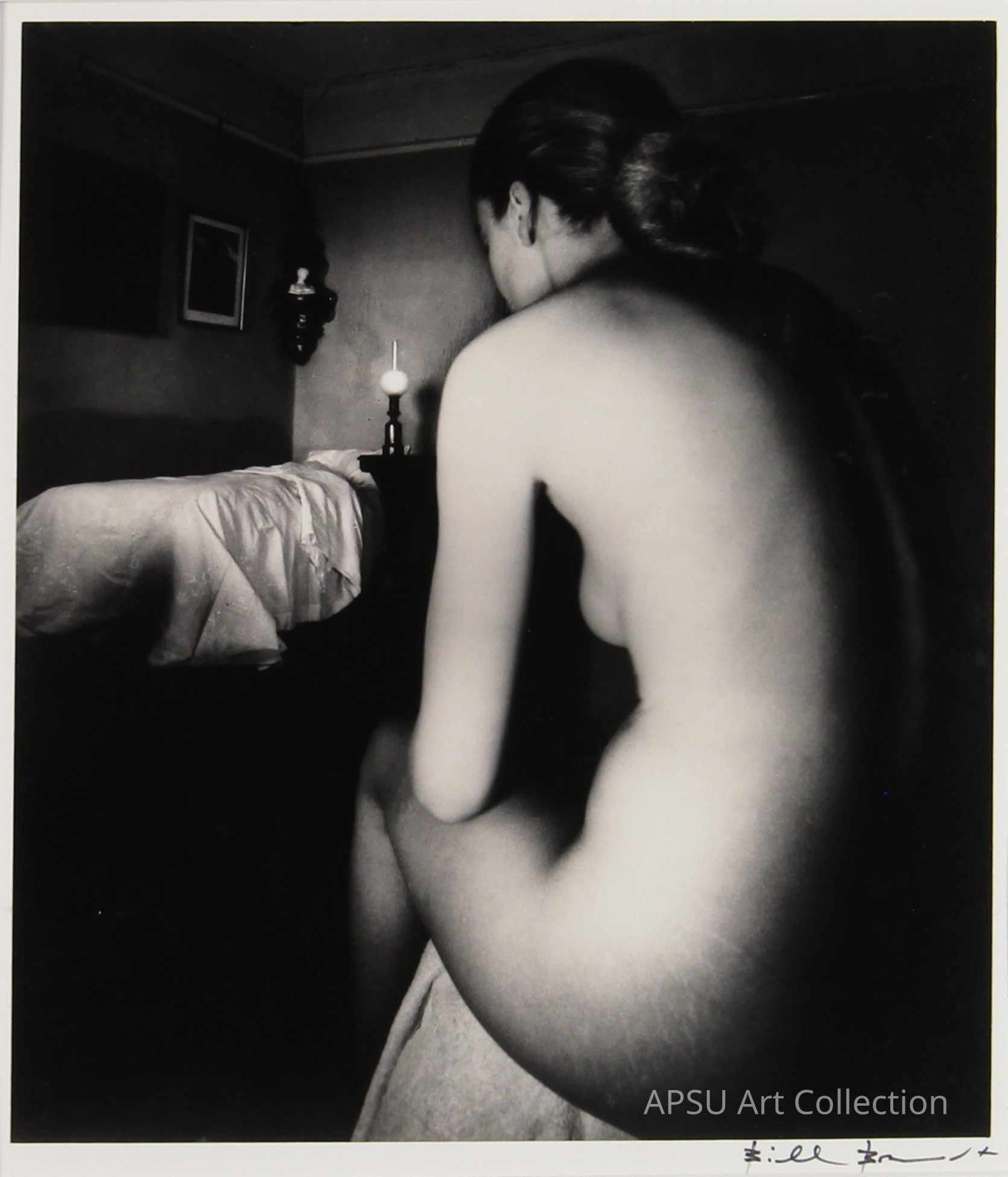 Black and white image of female nude facing away from viewer. Direct light source creates higher contrast on the figure's torso.Collection