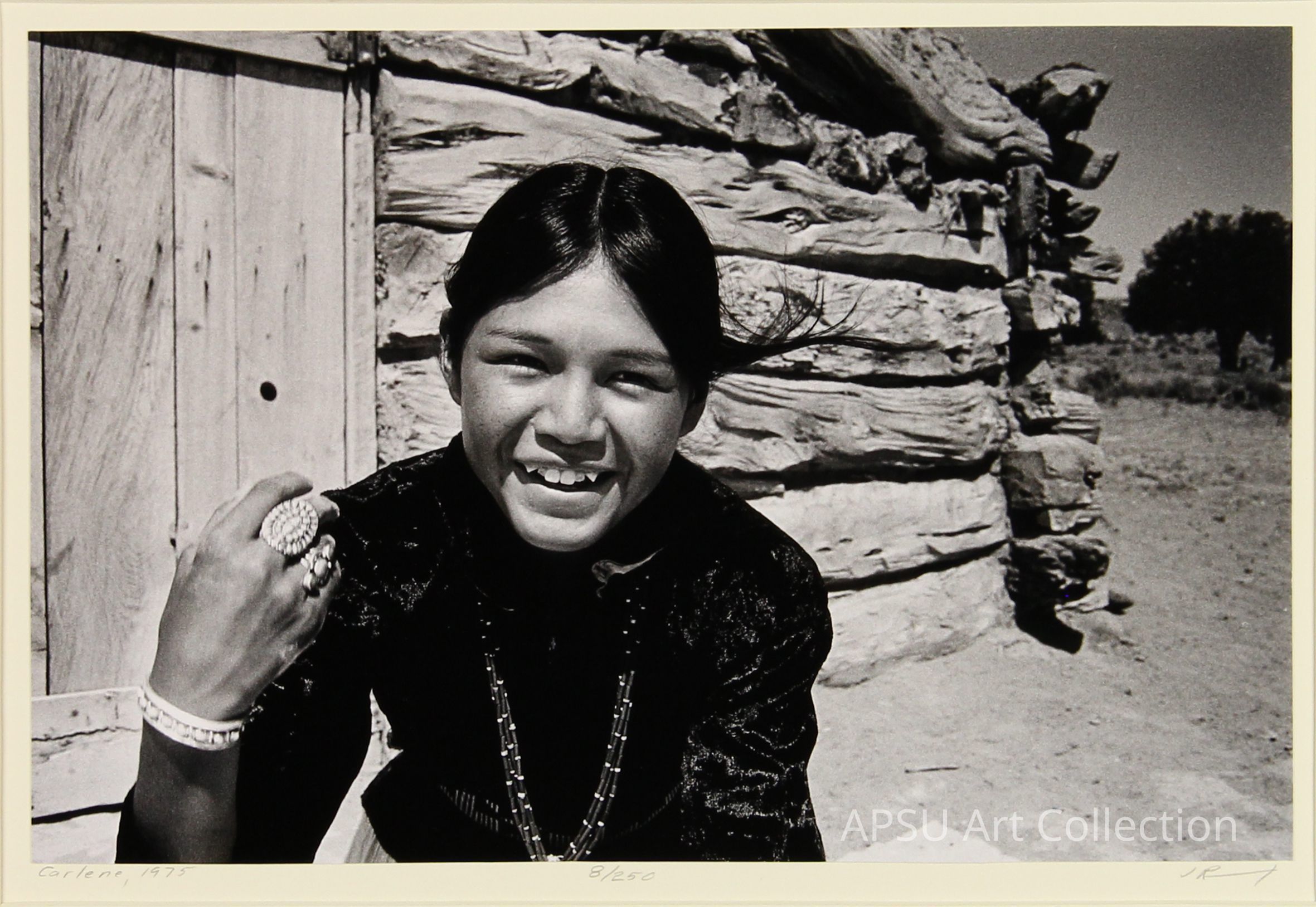 A portrait of a Native American woman with jewlery standing in a desert with rocks in the background.Collection