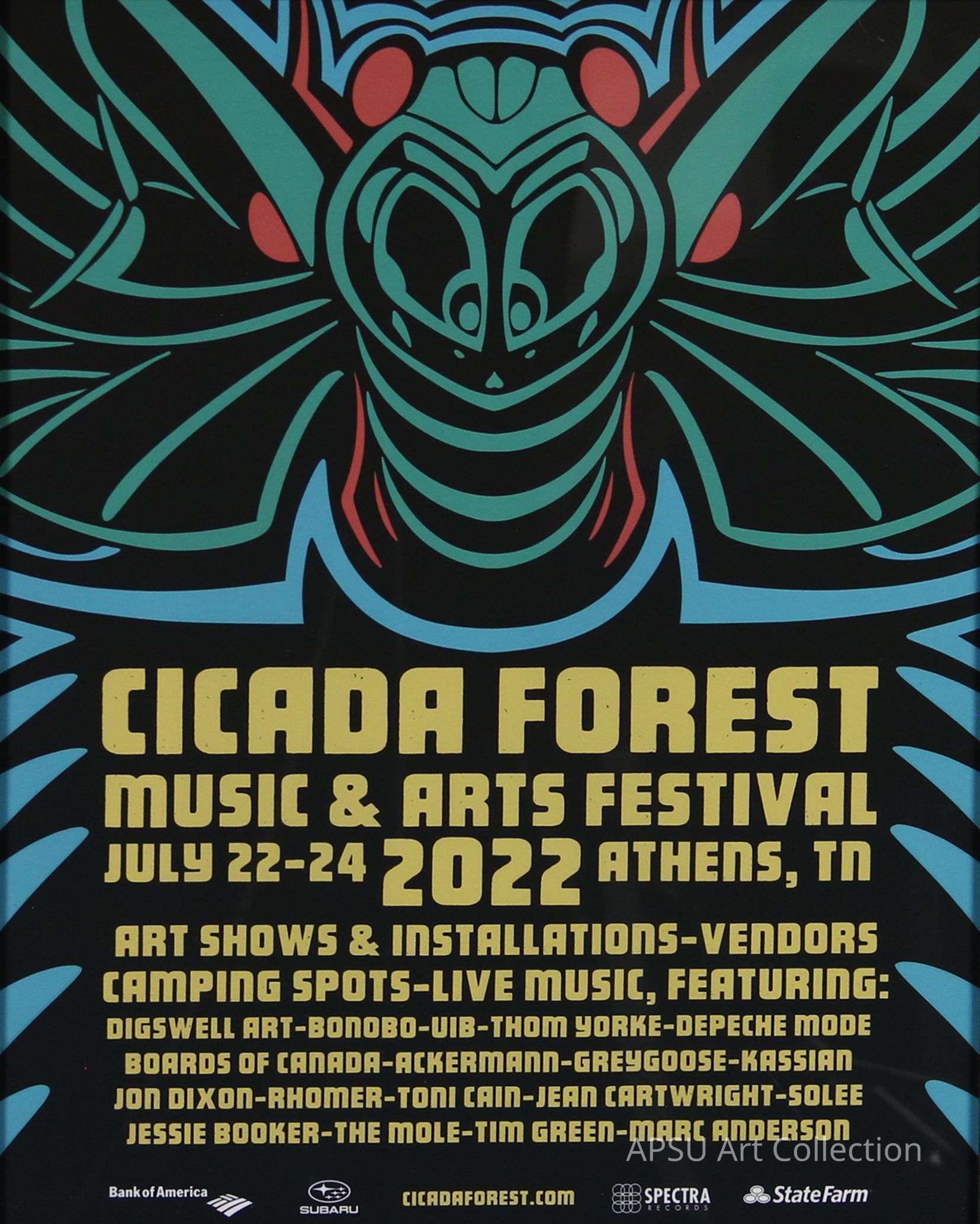 Cicada Forest Music & Arts Festival 2022 graphic design poster. Blue, green, and red colors with a yellow type and large cicada depicted above the information.Type of Print