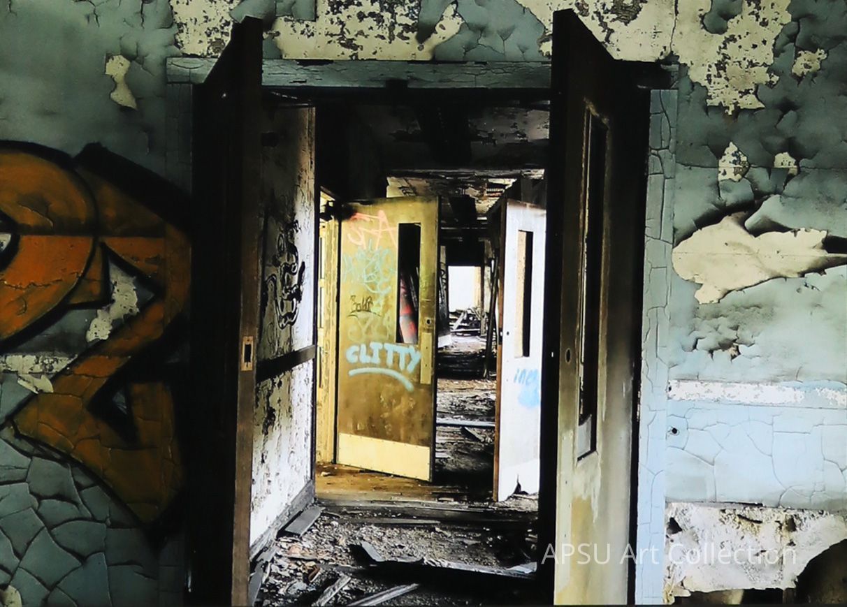 Photograph of the interior of an abandoned, deteriorated building. There is graffiti on the walls and doors.Collection