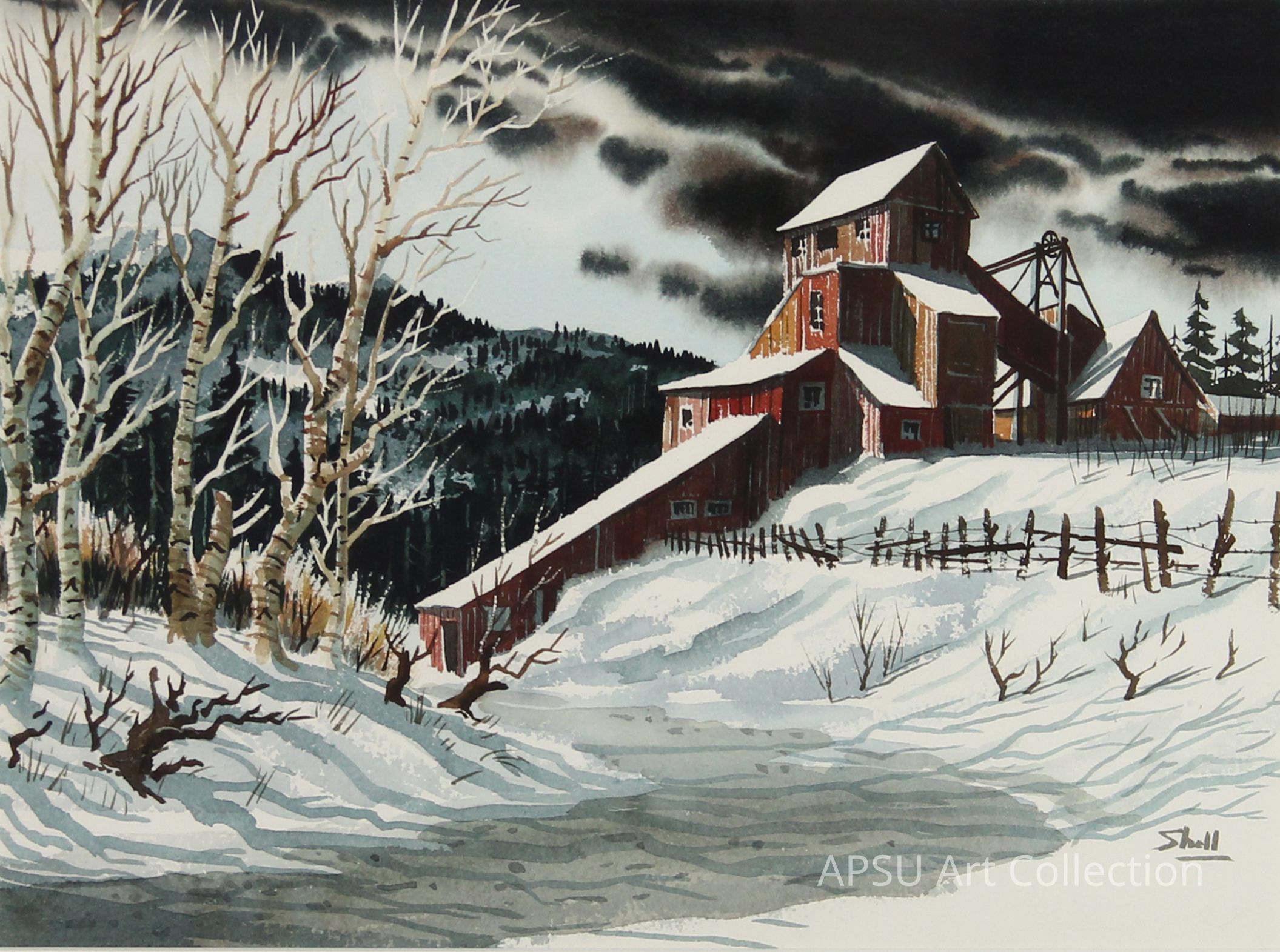A red mill in the snow with trees and a dark cloudy skyType of Painting