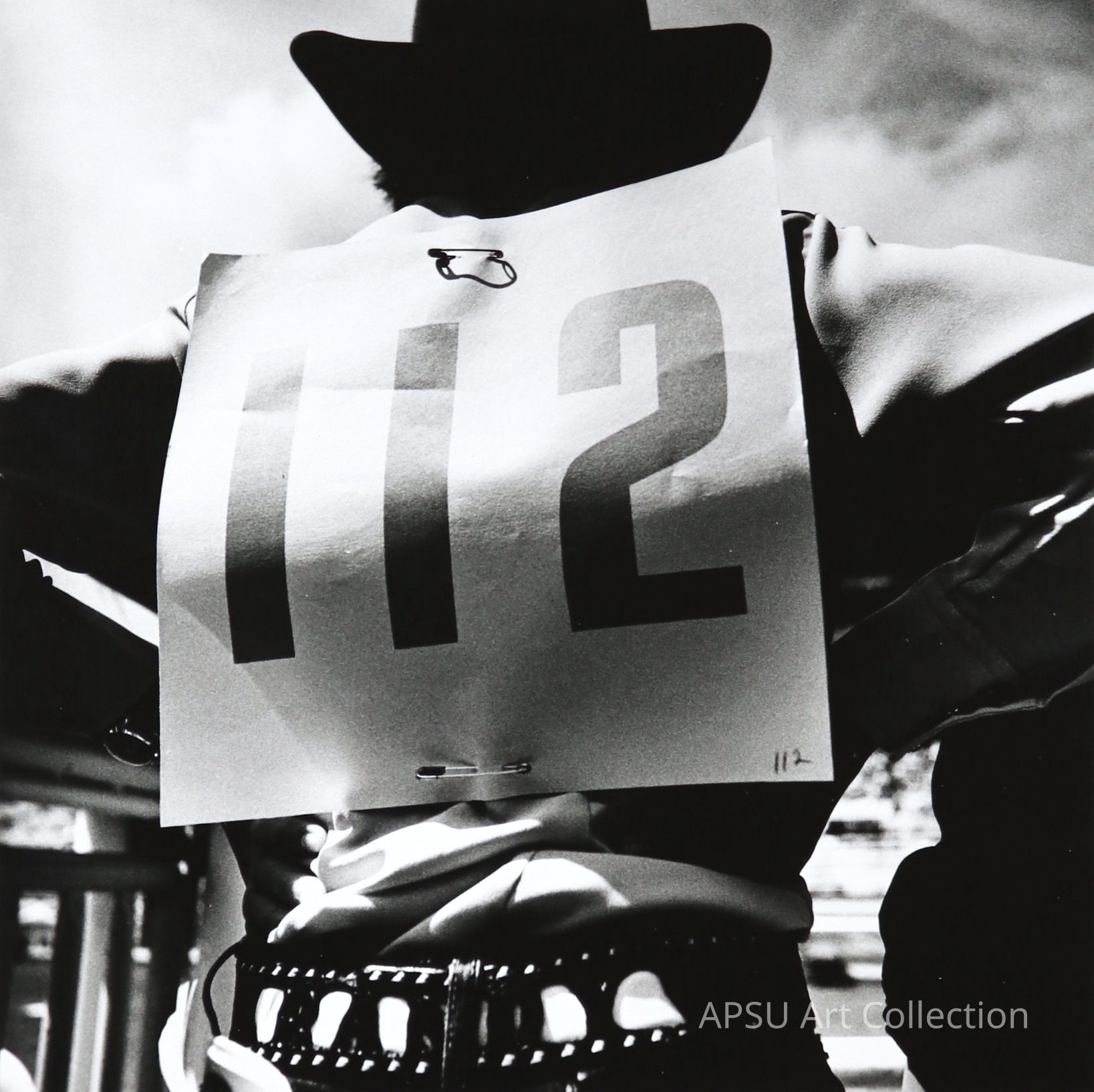 Photograph of the back of a cowboy with his number safety pinnned to his clothing.Collection