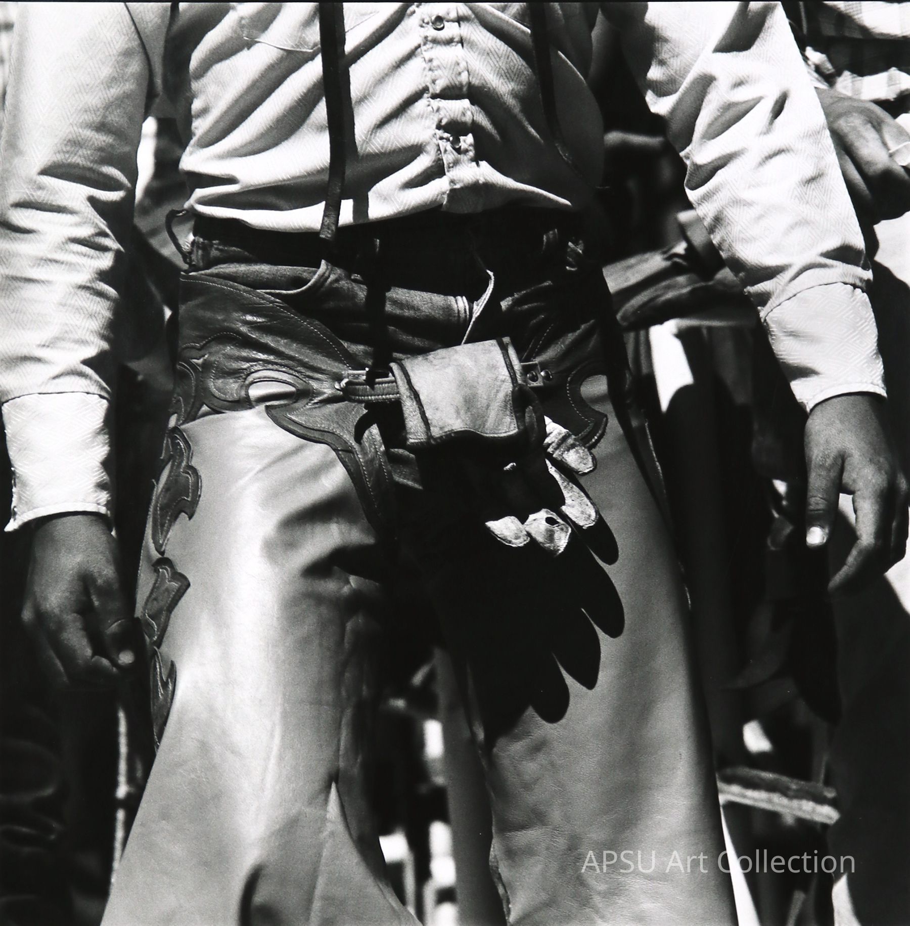 Photograph of the lower half of a cowboy. His gloves are tucked into his chaps.