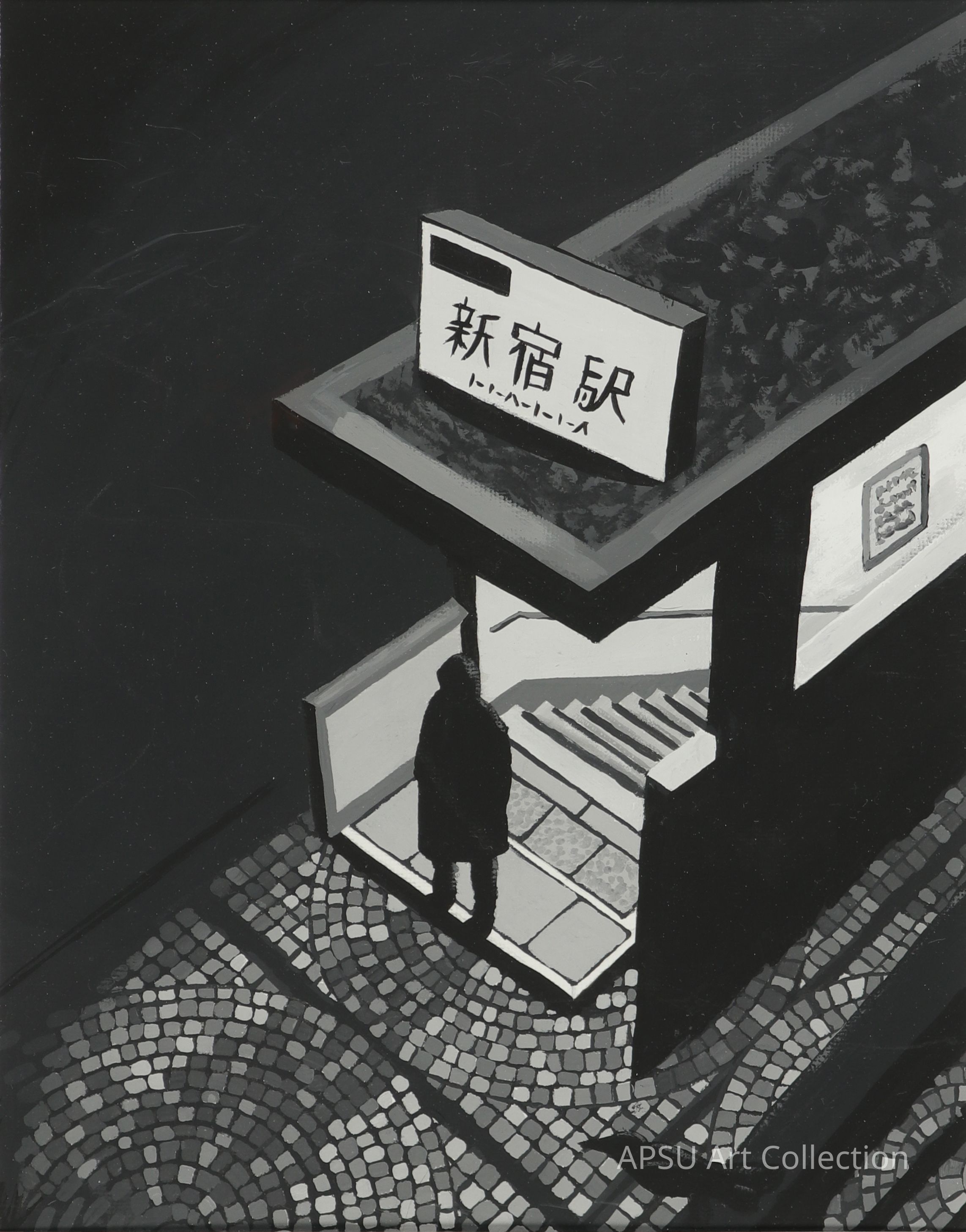Black and white acrylic painting of a silhouette standing by a stationType of Painting