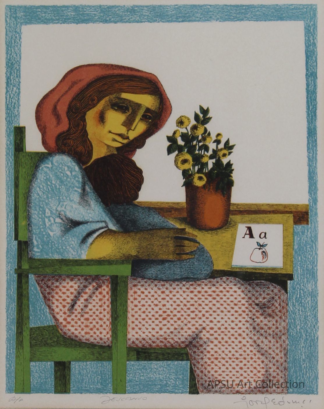 Artist proof by Jorge Dumas, female figure seated near table or desk with a paper that has an A with apple.