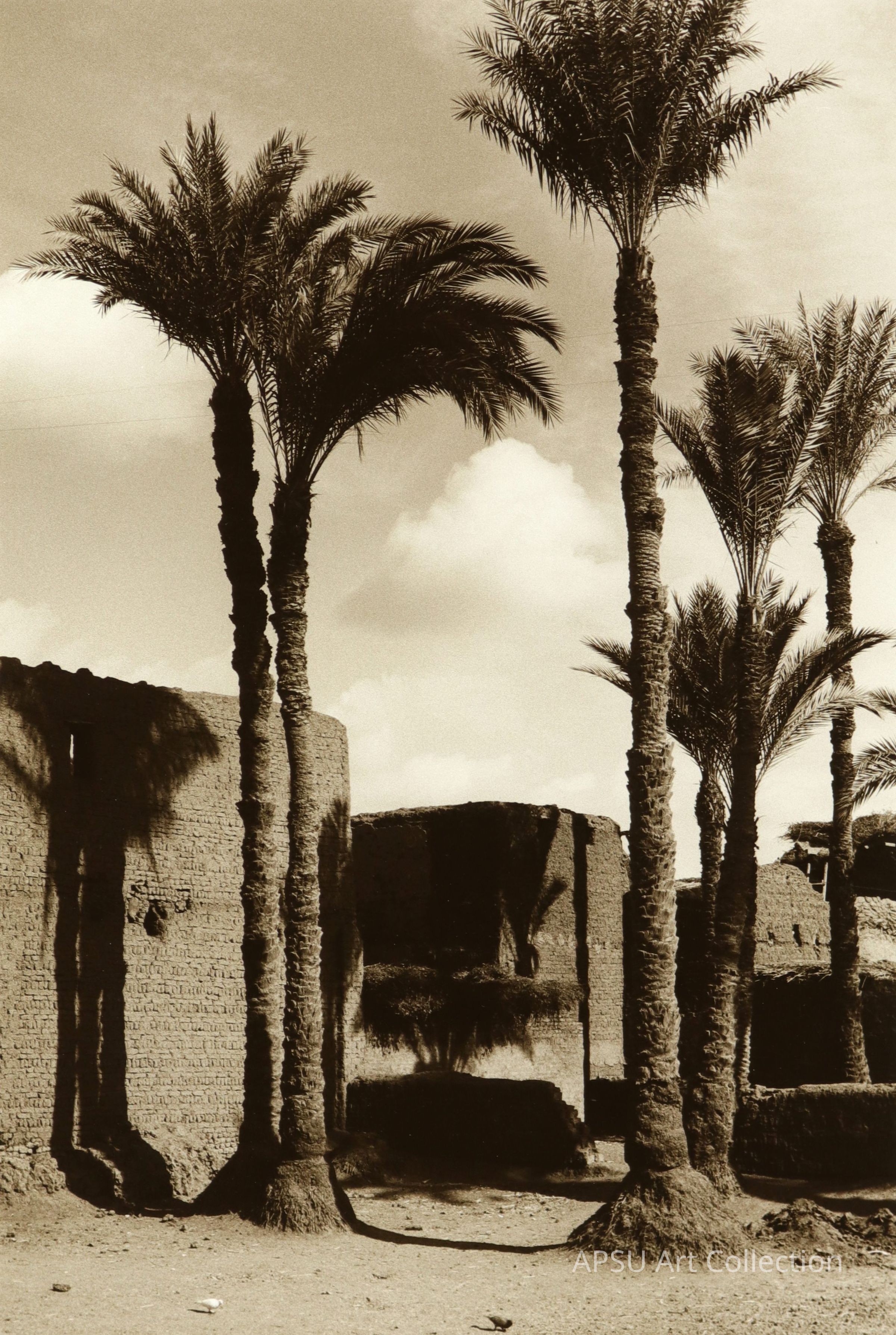 Sepia photograph of palm trees next to buildings in EgyptCollection
