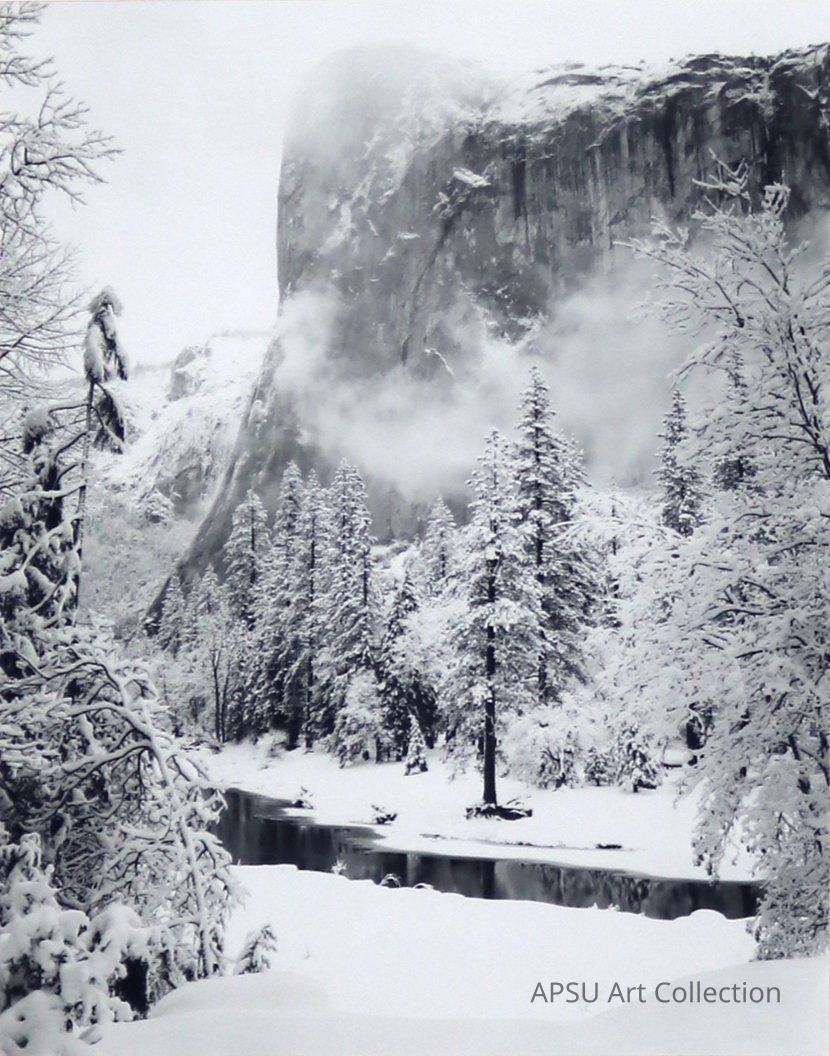 Black and white photograph of El Capitan, a prominent rock face in Yosemite National Park. In the foreground, snow covered trees line a partially frozen stream.Collection