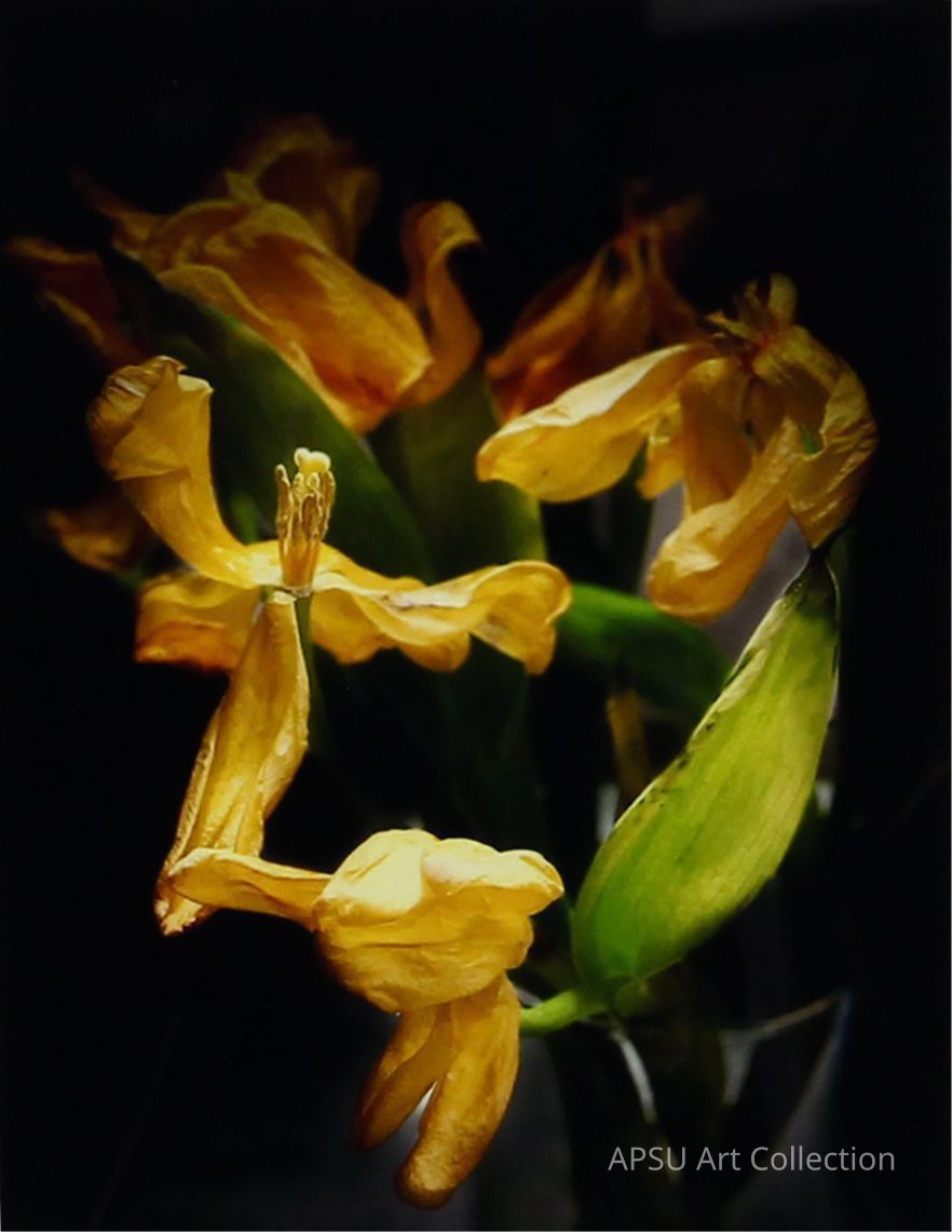 A cluster of wilted yellow flowers with curled petals appears delicately illuminated against a dark background.Collection