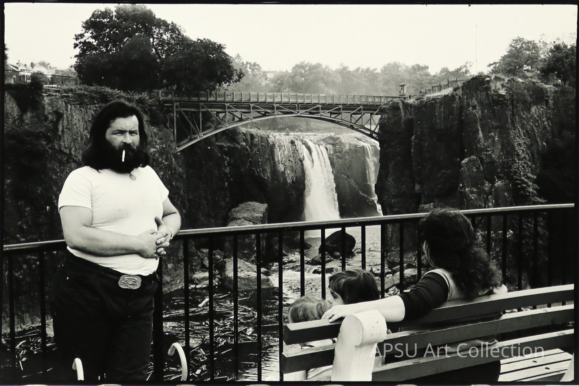 Gelatin Silver Print photograph of a family at a waterfall. There is a man smoking a cigarette on the left side of the photo, with a woman and her children on a bench on the right side.Collection