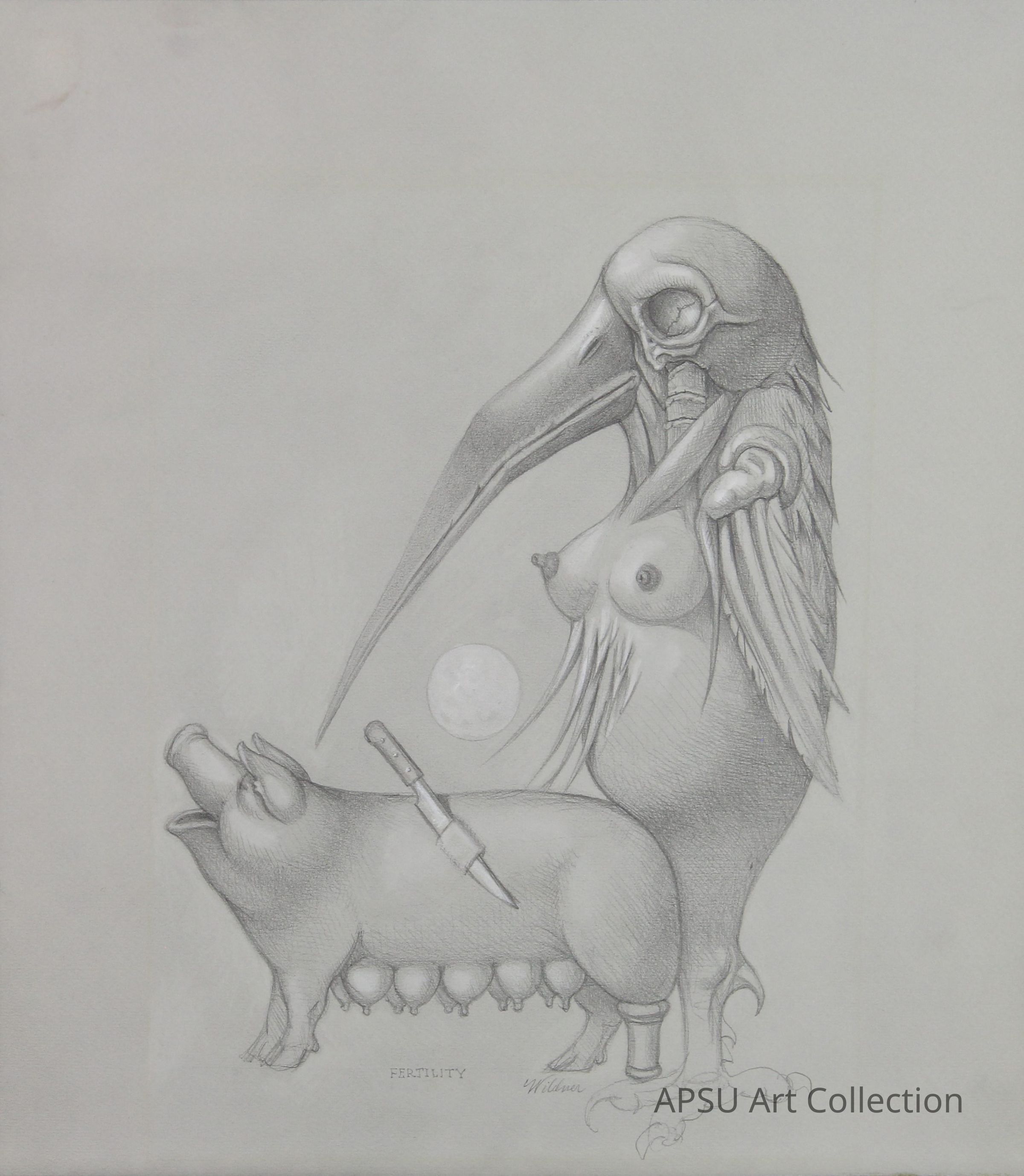 Werner Wildner, "Fertility", graphite drawing of a creature with a big and a maternal pigType of Drawing
