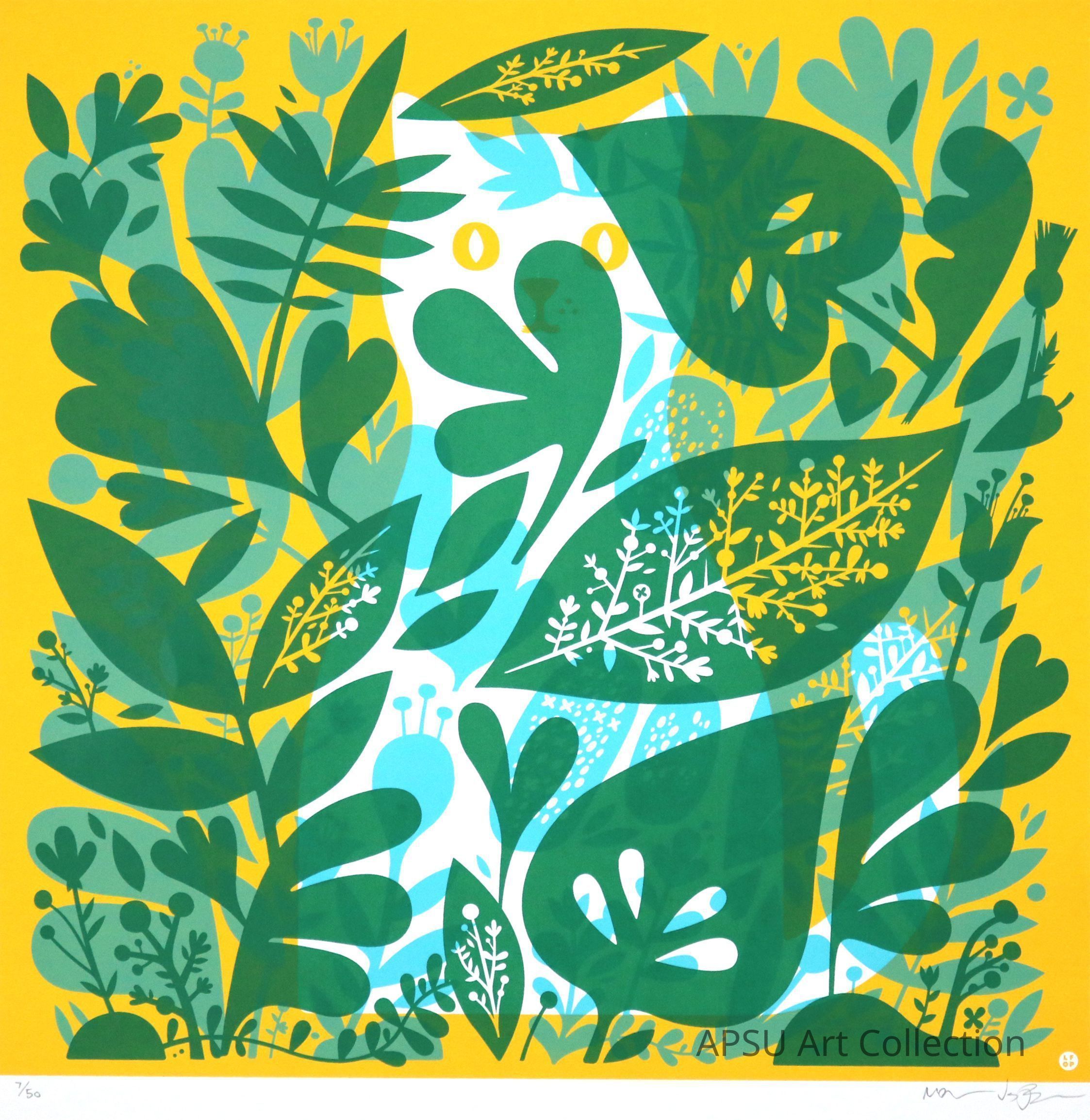 This is a vibrant artwork featuring an abstract representation of a white cat subtly hidden among various green and blue leaves and floral elements on a bright yellow background, giving a sense of a lively, natural setting. The piece is defined by its bold use of color and stylized foliage, creating a playful interaction between the animal figure and its environment.