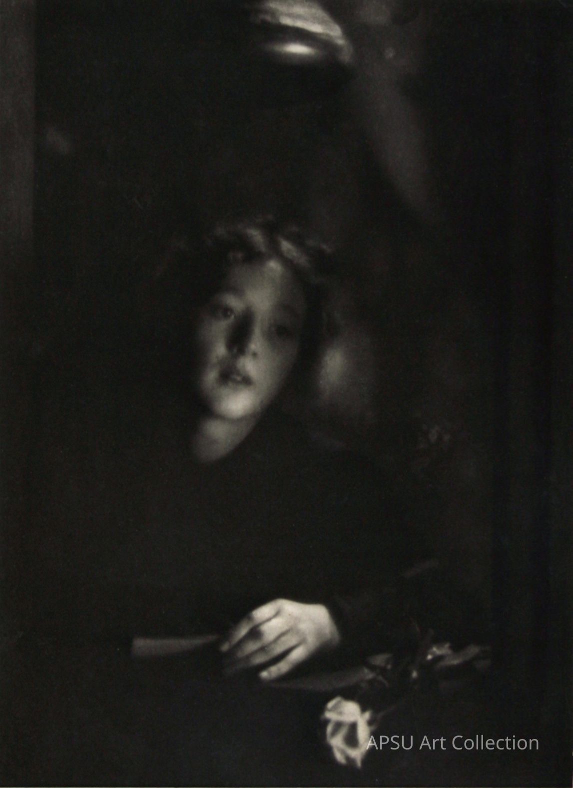 Photographic portrait of seated woman with arm resting on a table, single rose in front on the table. Written on the back of frame "Tunnell 1911"