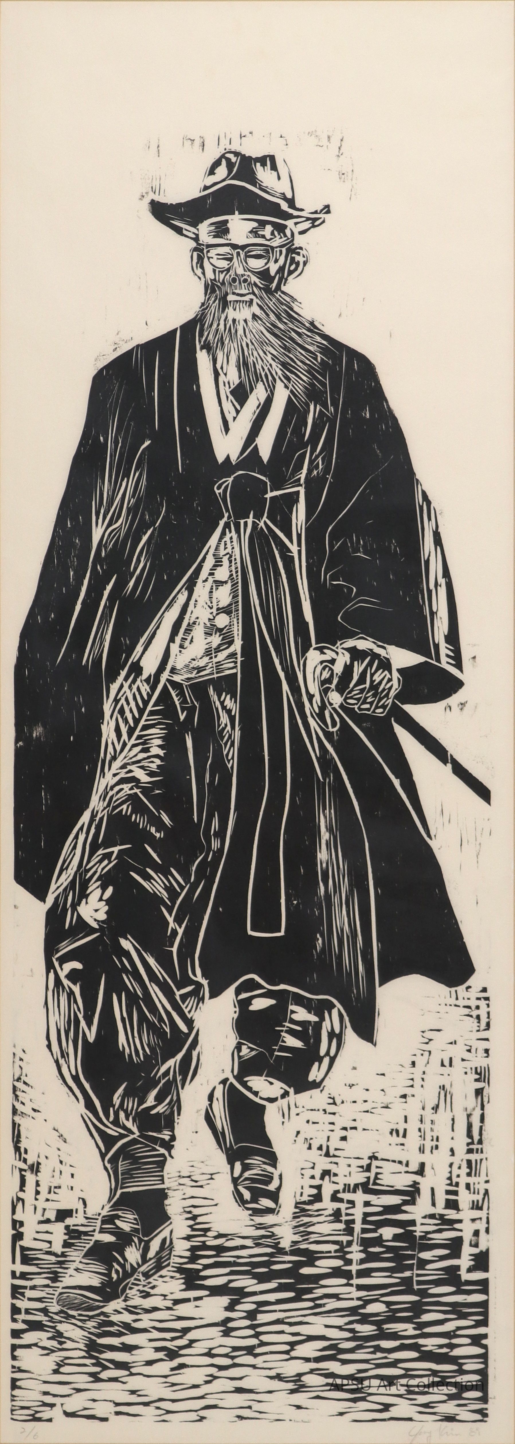 Woodcut. Image of a bearded man walking, cane in his left hand.