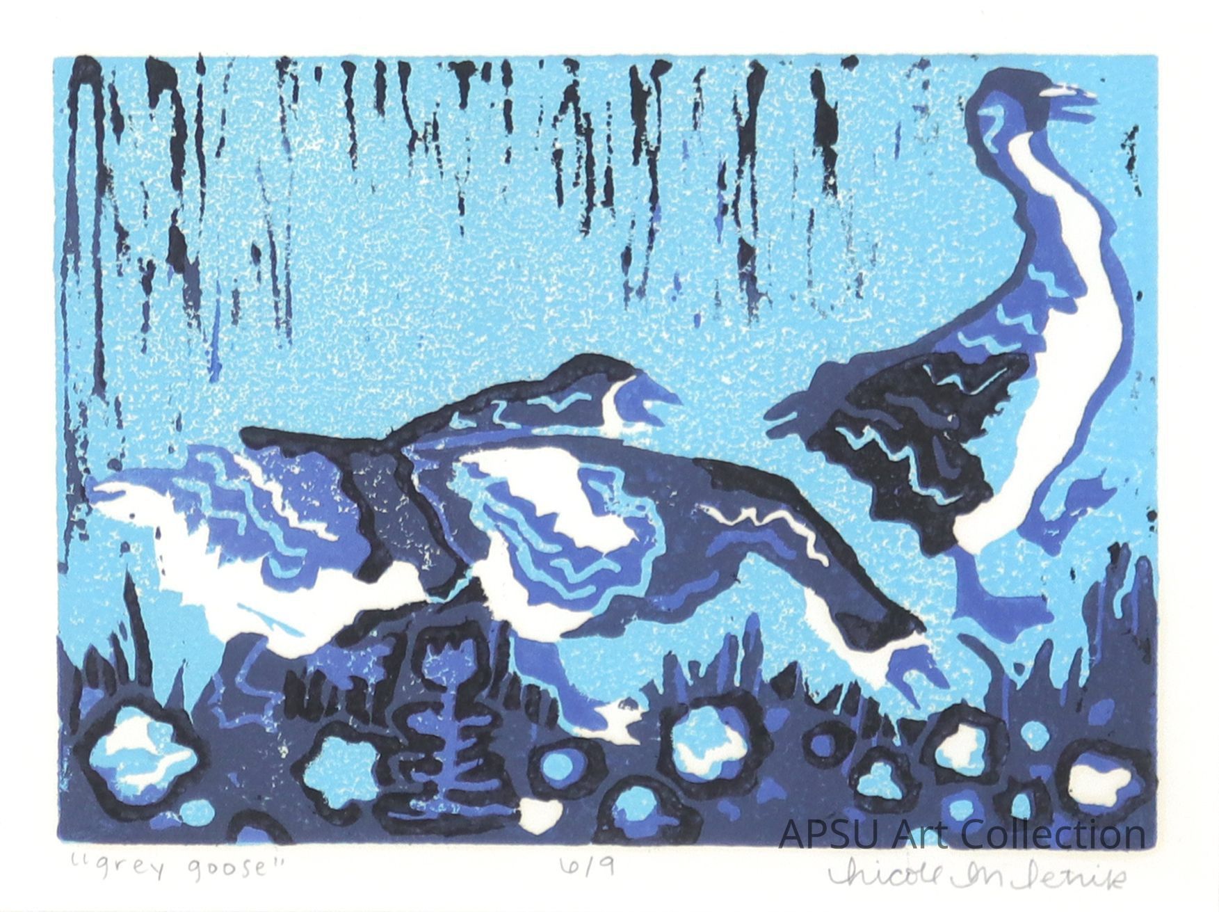 two geese, one chasing the other in front of a light blue background.Type of Print