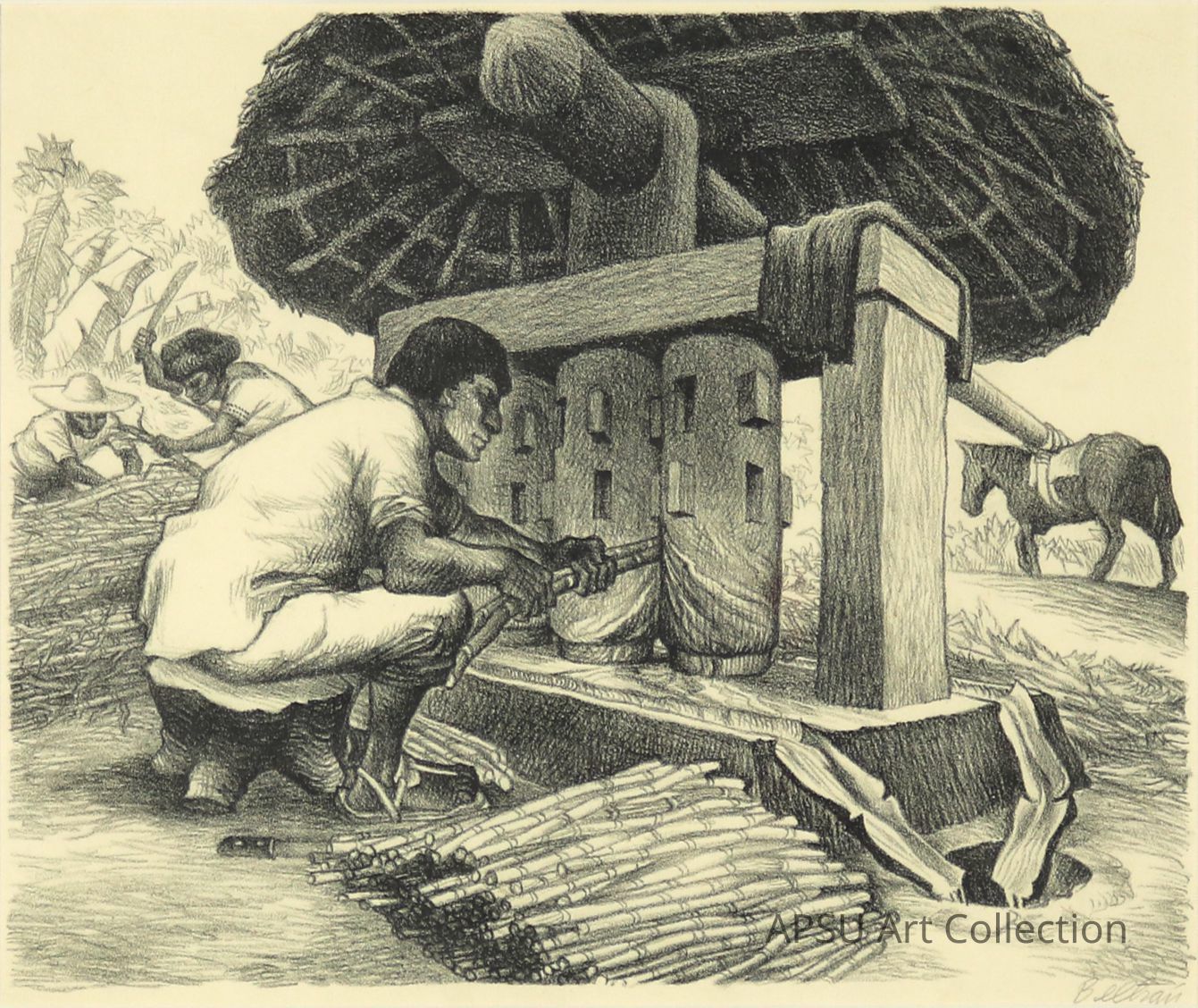 Alberto Beltrán, "Grinding Sugar Cane (Cuetzalan, State of Puebla) from Mexican People, 1946, lithograph print of a drawing, print also in the collection of the Art Institute of Chicago