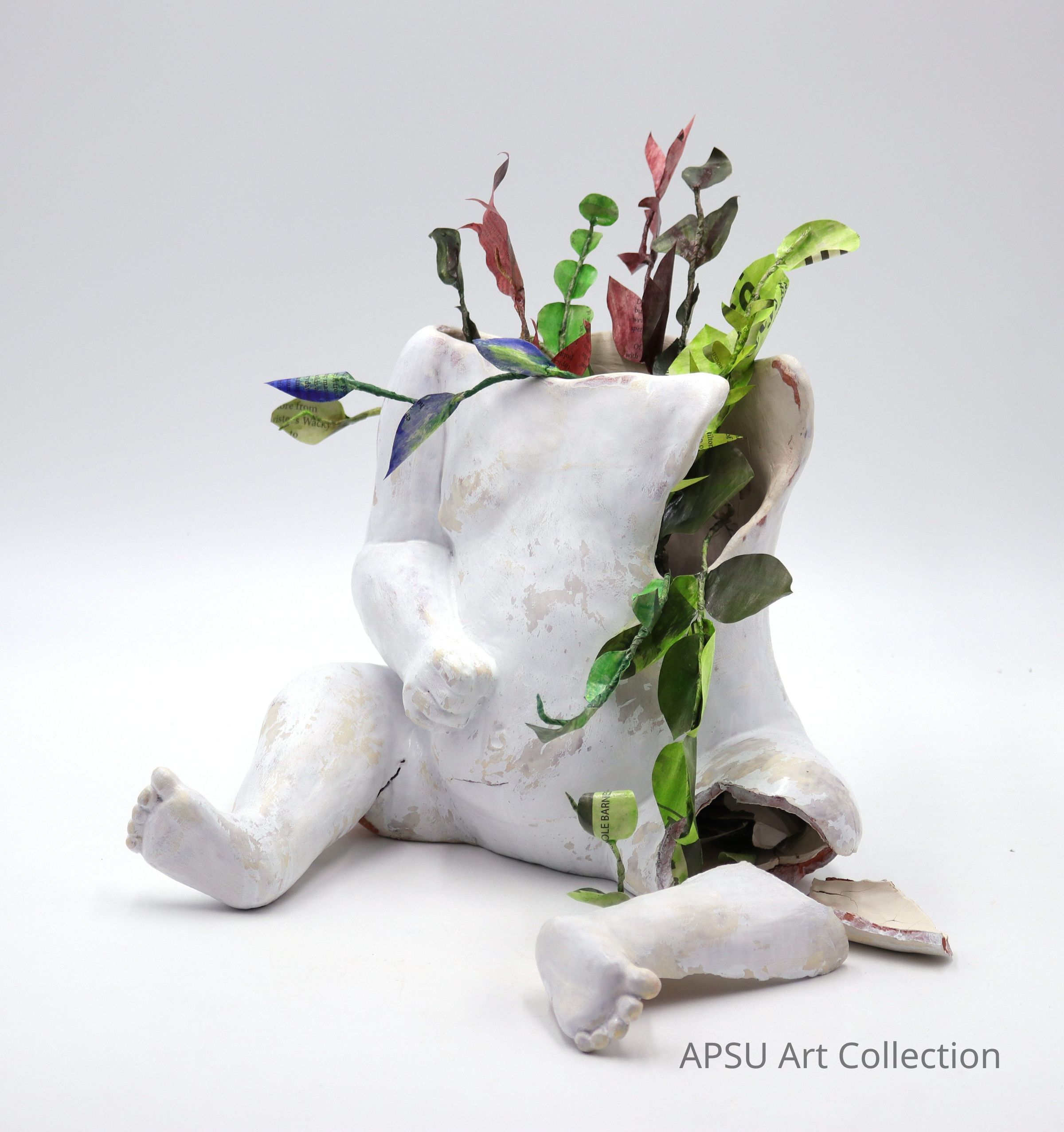 The image shows a unique sculpture of a white, armless, headless humanoid figure with an open top from which various colorful leaves and plants emerge. The sculpture's surface appears to have a textured, slightly weathered finish. Its legs are positioned as if sitting, adding a whimsical, abstract quality to the piece. The leaves sprouting from the top and sides vary in color, including shades of green, red, and some hints of purple, contributing to an organic, lively contrast with the figure's stark white ceramic-like material.