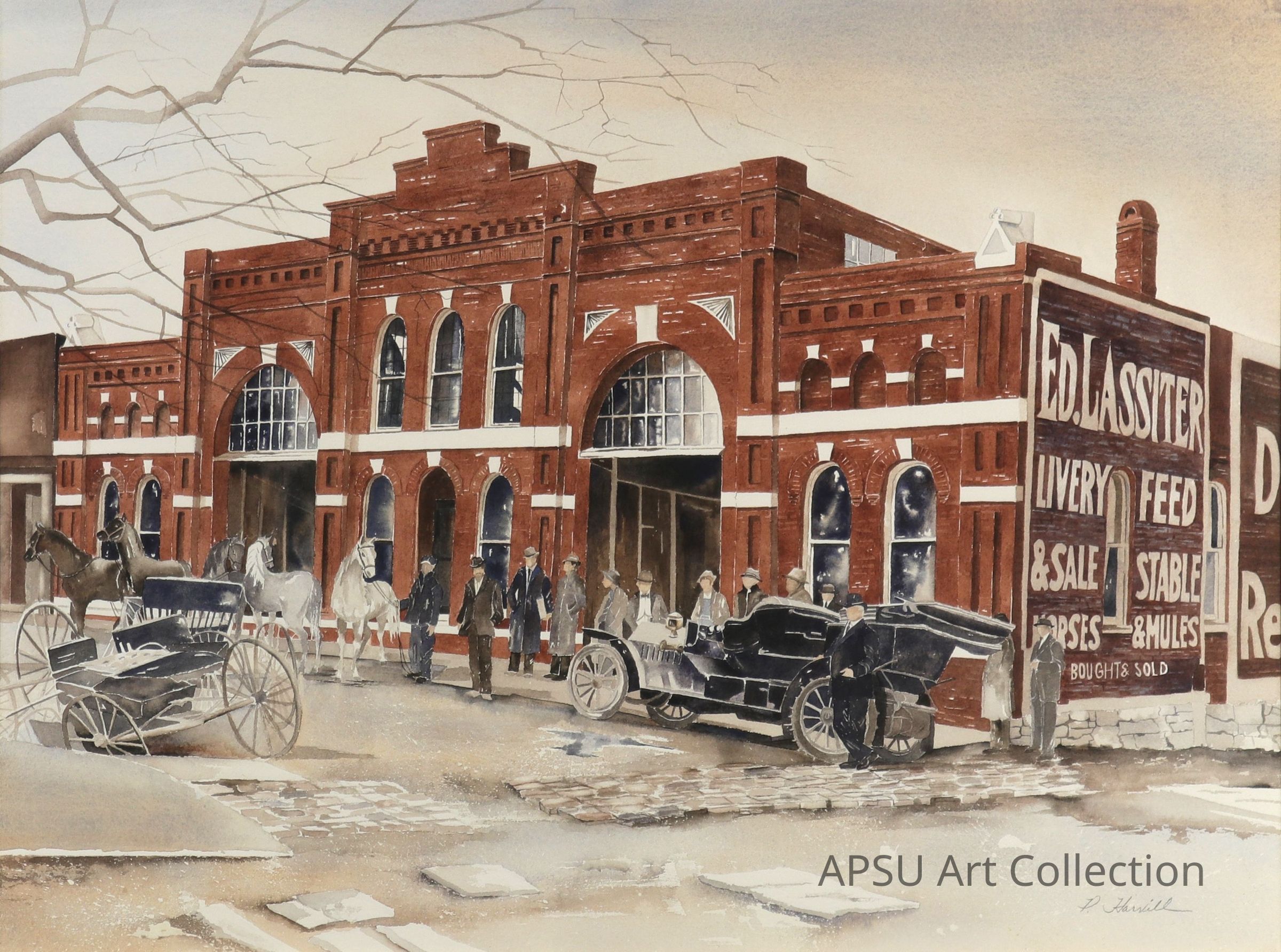 A redbrick building with a group of men standing around with horses and carriages in the winter.Type of Painting